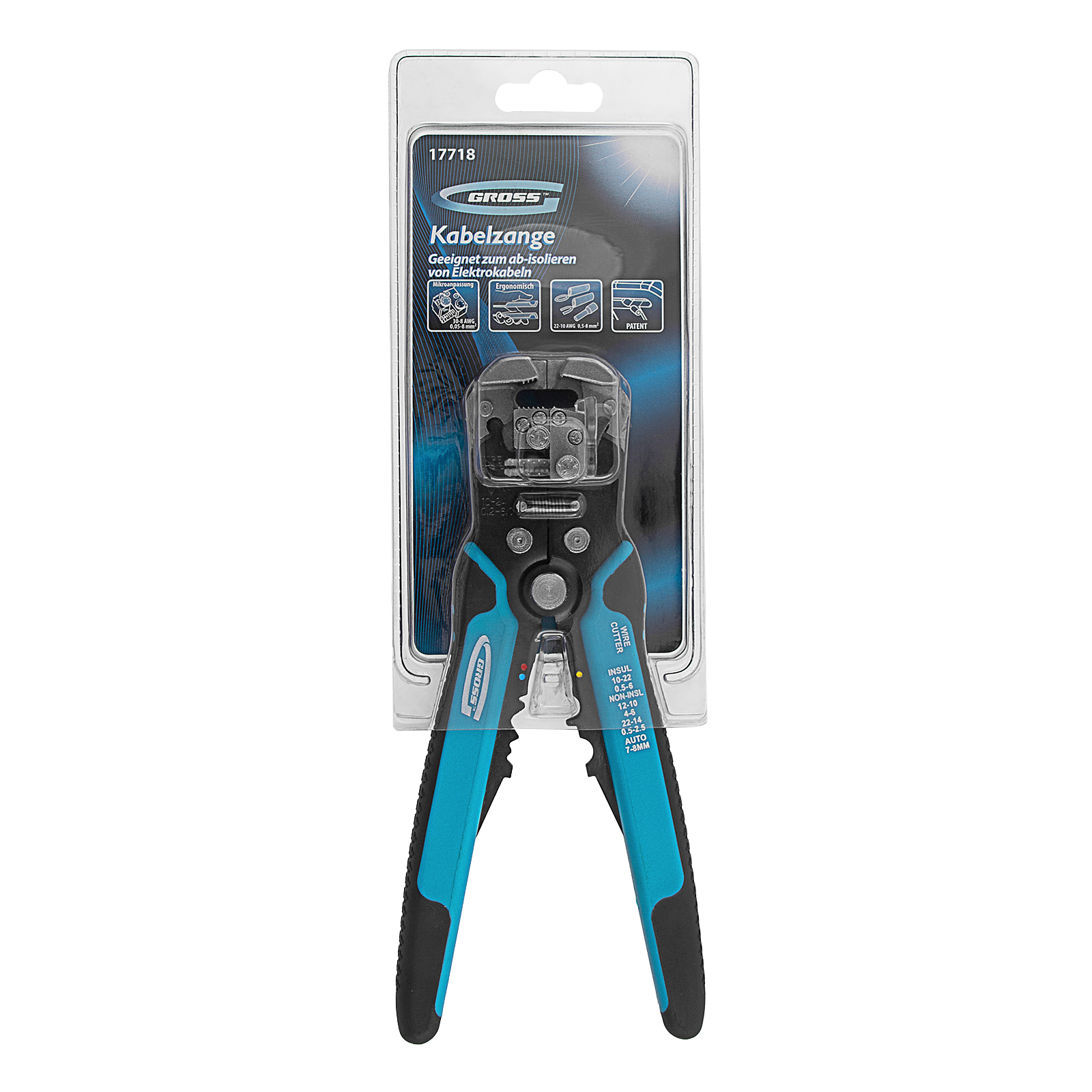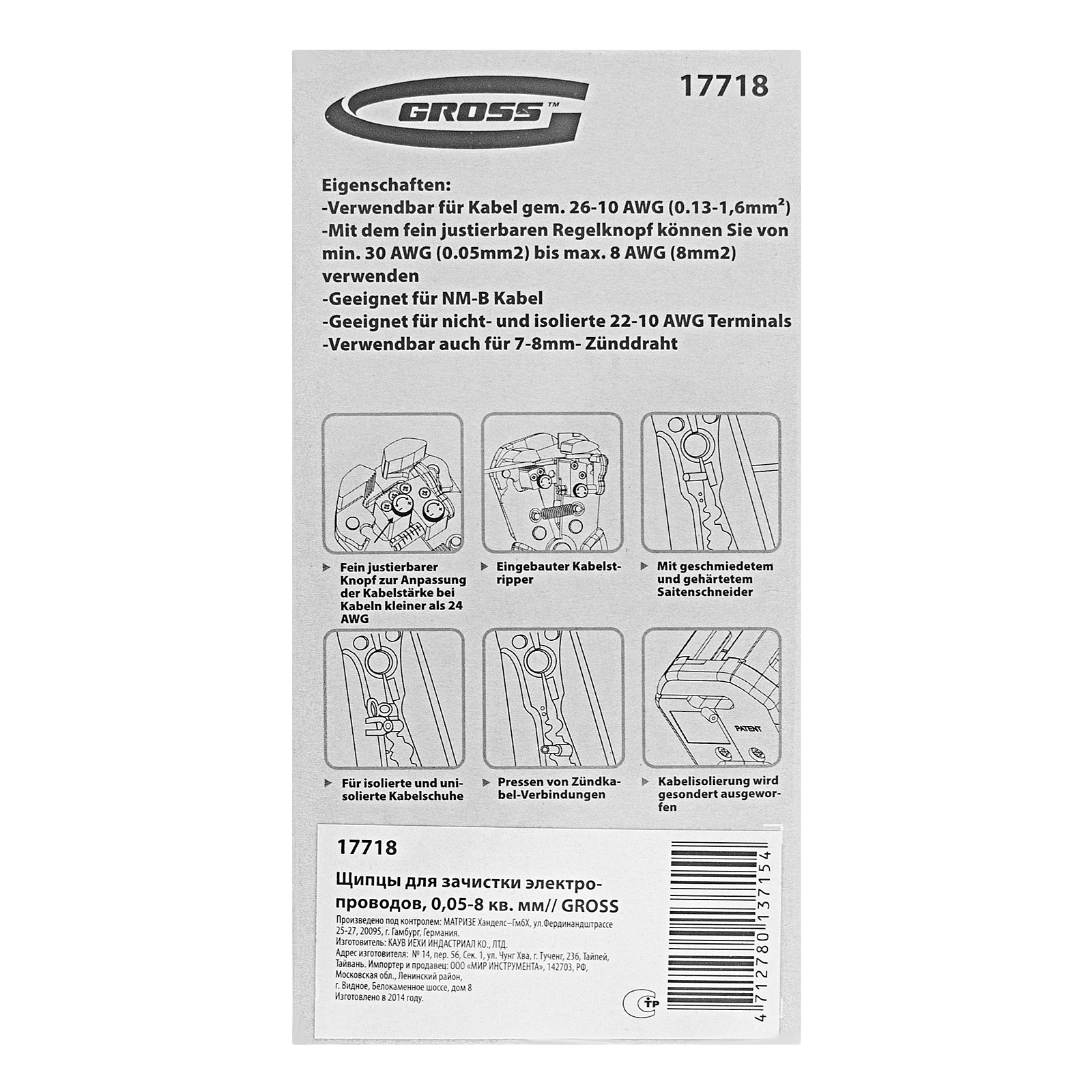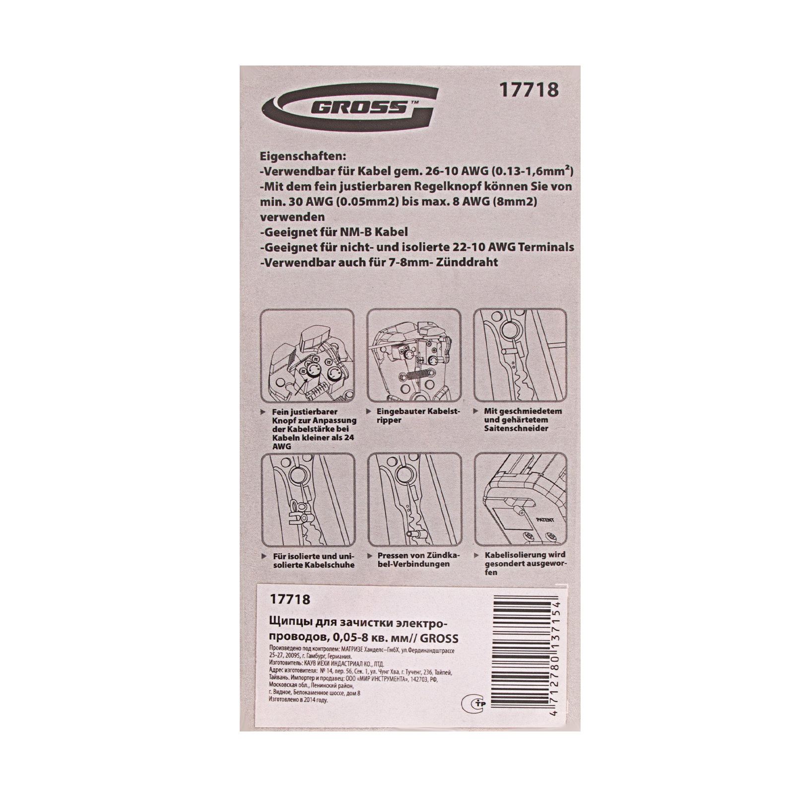 <p>Щипцы для зачистки электропроводов Gross 17718 предназначены для обрезки и зачистки медных и алюминиевых проводов, обжима изолированных и неизолированных клемм, а также одножильных проводов сечением 0,05-8 мм². Инструмент пригодится для бытового и профессионального использования.</p><h2>Преимущества</h2><ul><li>Многофункциональность — клещи позволяют регулировать длину снимаемой изоляции и силу зачистки для работы с проводами разных размеров.</li><li>Долговечность — основа инструмента выполнена из прочной стали.</li><li>Комфортная работа — двухкомпонентные рукоятки эргономичной формы обеспечивают удобный и безопасный захват.</li><li>Малый вес 342 г — длительная работа щипцами не вызывает дискомфорт.</li></ul>