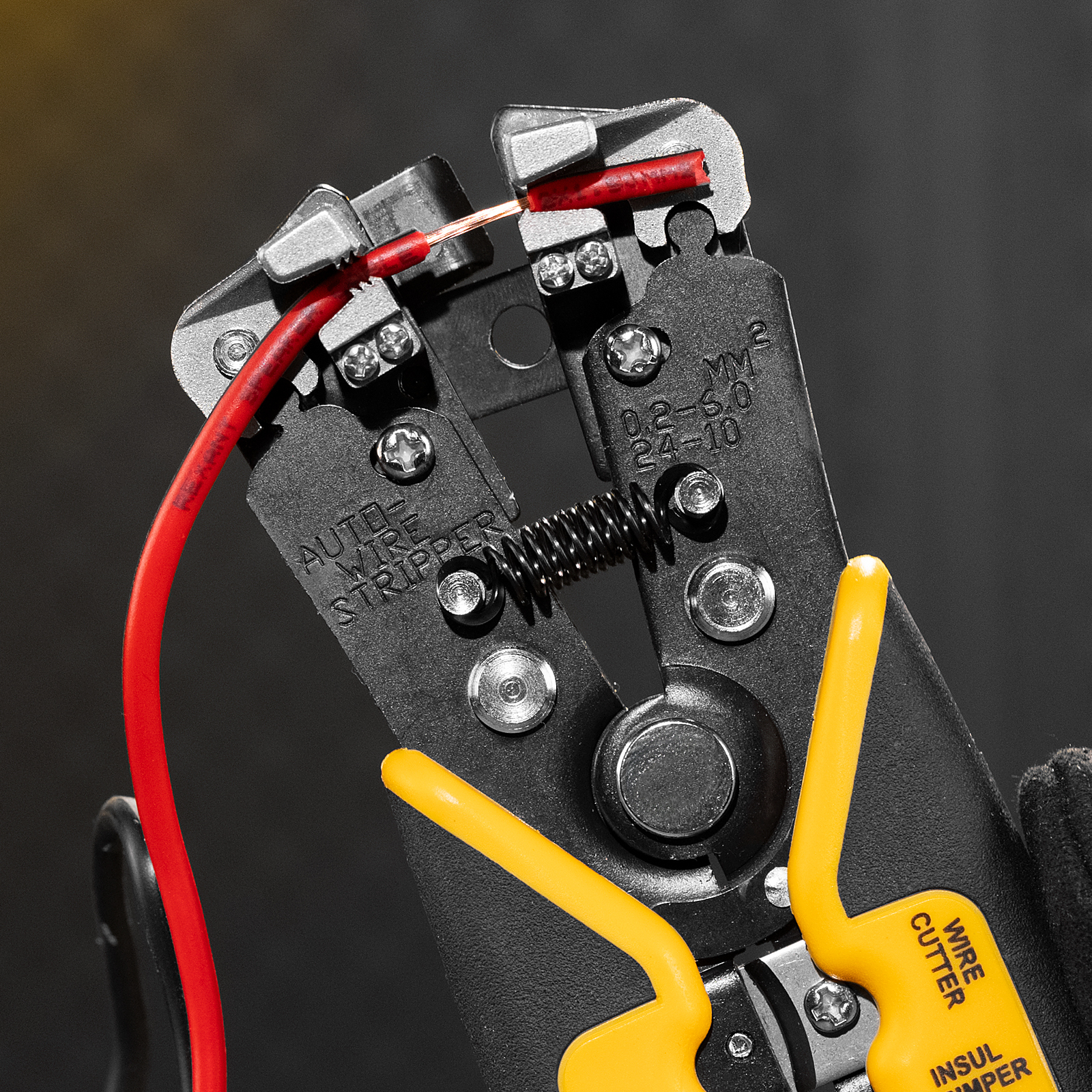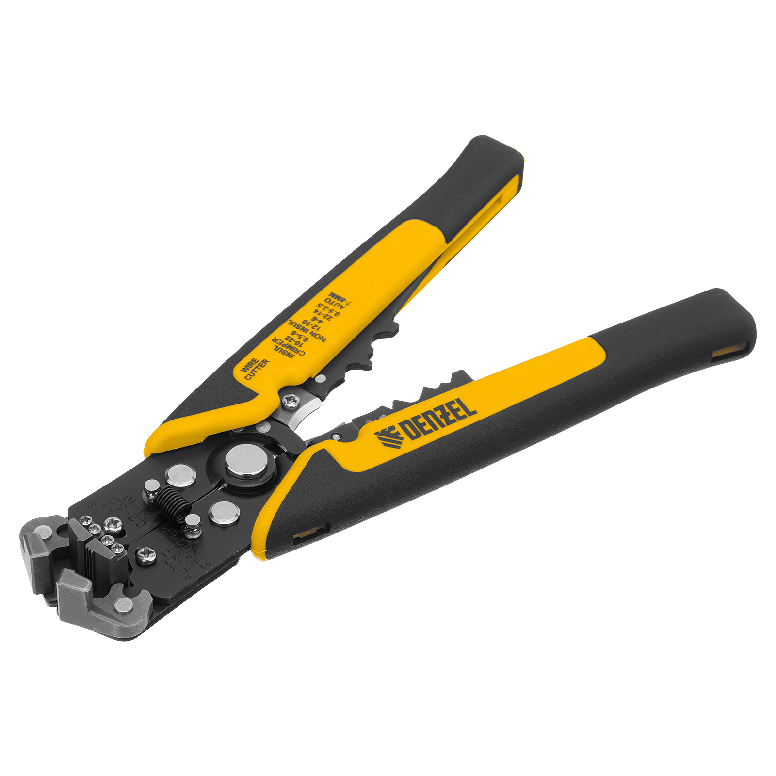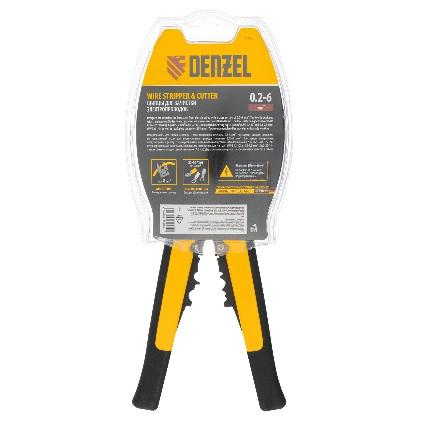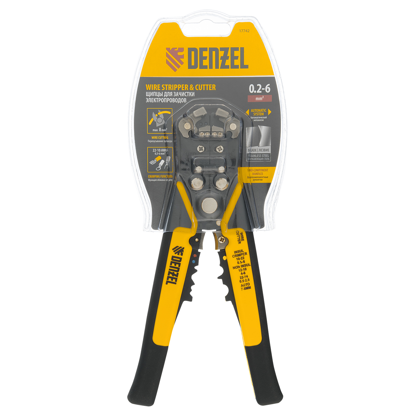 <p>Щипцы Denzel 17742 — инструмент для зачистки электропроводов сечением 0,2-6 мм2 (22-10 AWG), способный дополнительно выполнять функцию обрезания проводов. Используется при проведении электромонтажных работ, подходит для профессионального применения.</p><h2>Преимущества</h2><ul><li>Готовность к работе — регулировка инструмента в зависимости от диаметра проводов не требуется.</li><li>Надежность — лезвия для обрезания проводов изготовлены из нержавеющей стали.</li><li>Авторазжим — рукоятки автоматически занимают исходное положение, что экономит время и силы мастера.</li><li>Комфортная работа — двухкомпонентные рукоятки удобно ложатся в руку.</li></ul>