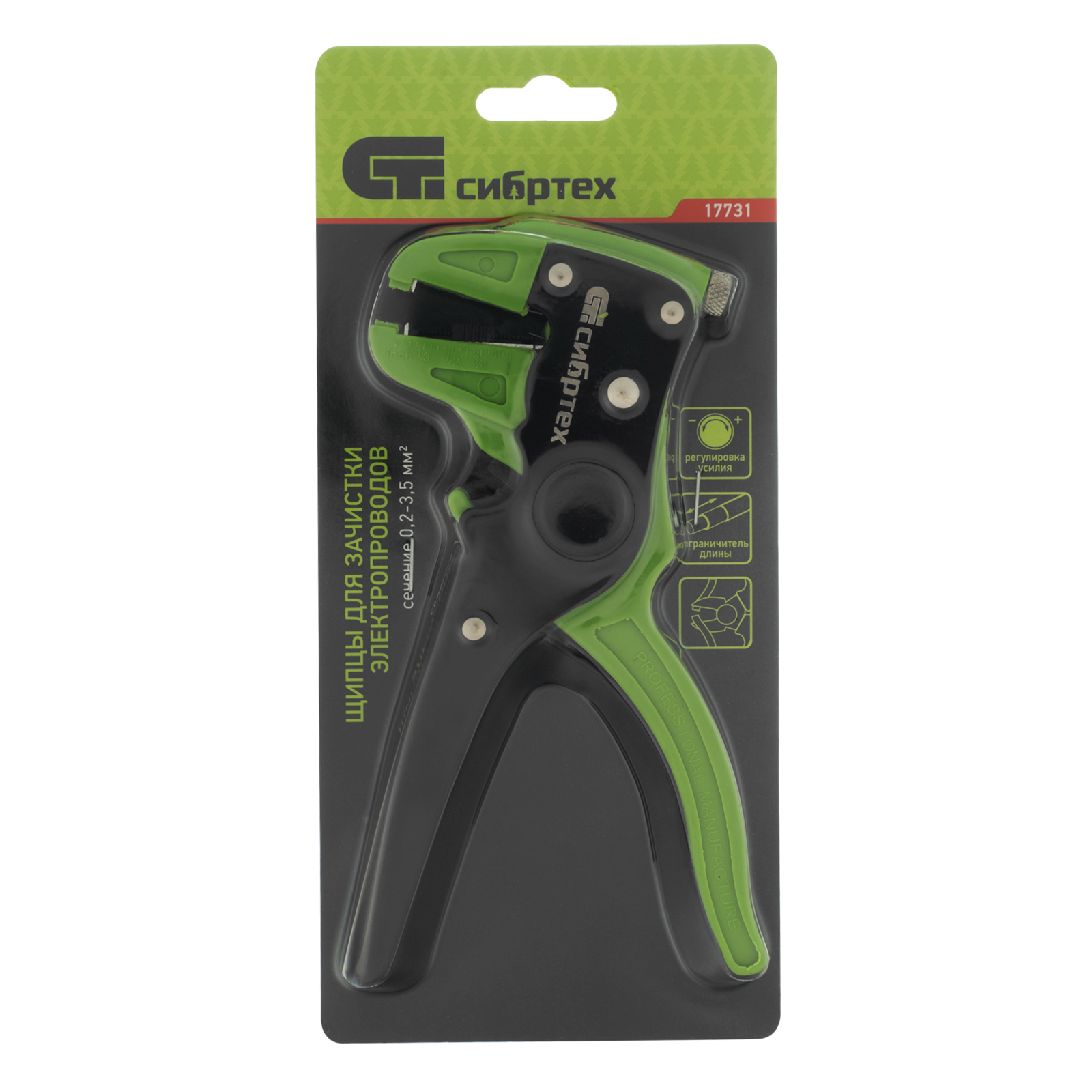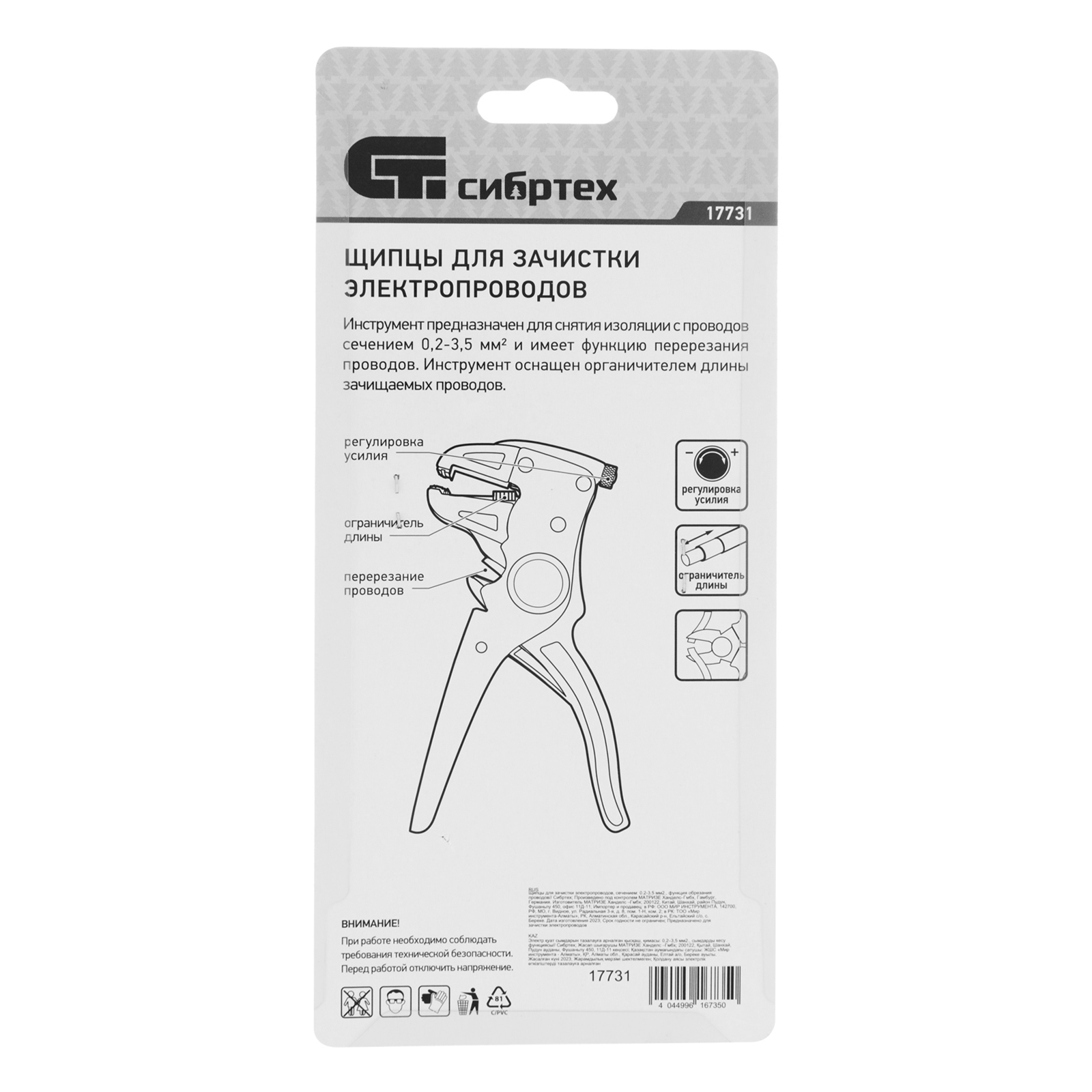 <p>Щипцы Сибртех 17731 рассчитаны на зачистку и снятие изоляции с электропроводов сечением 0,2-3,5 мм2, а также они оснащены кусачками для обрезания кабеля. Инструмент станет незаменимым помощником в квартире, гараже, на даче, производстве, строительной площадке во время выполнения электромонтажных работ.</p><h2>Преимущества</h2><ul><li>Встроенный ограничитель позволяет регулировать длину зачищаемых электропроводов.</li><li>Функция авторазжима рукояток повышает удобство работы.</li><li>Руки не устают во время работы, т.к. вес щипцов составляет 218 г.</li></ul>