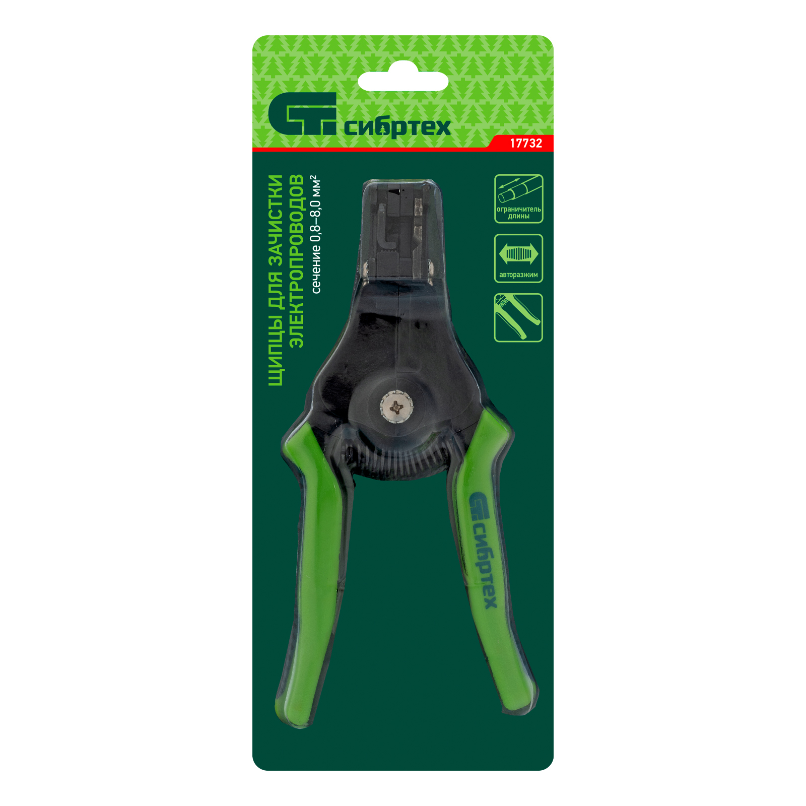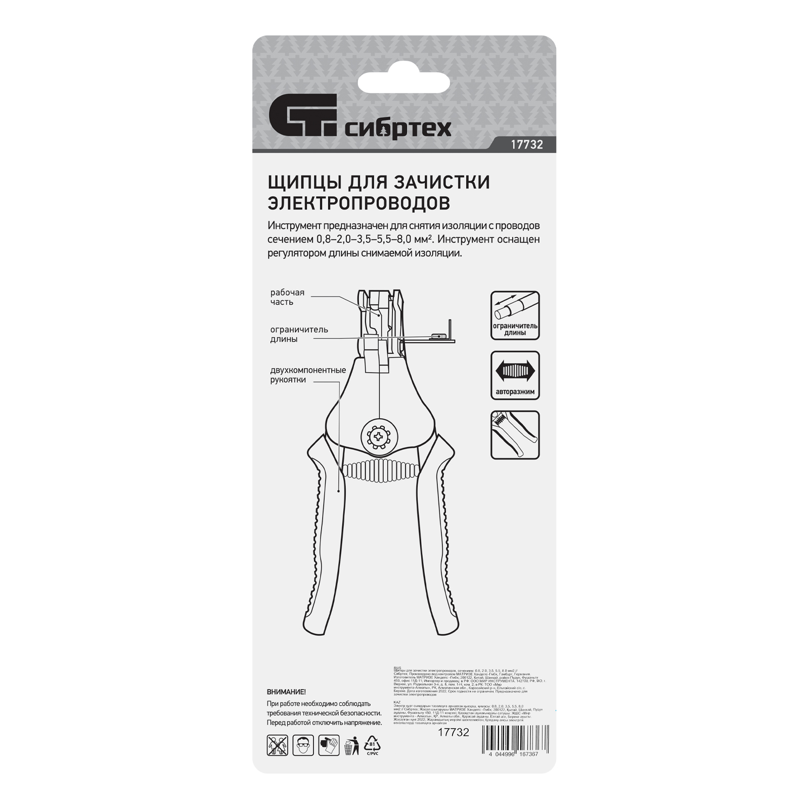<p>Щипцы Сибртех 17732 рассчитаны на зачистку и снятие изоляции с электропроводов сечением 0,8, 2,0, 3,5, 5,5, 8,0 мм2. Инструмент станет незаменимым помощником в квартире, гараже, на даче, производстве, строительной площадке во время выполнения электромонтажных работ.</p><h2>Преимущества</h2><ul><li>Встроенный ограничитель позволяет регулировать длину зачищаемых электропроводов.</li><li>Функция авторазжима рукояток повышает удобство работы.</li><li>Руки не устают во время работы, т.к. вес щипцов составляет 384 г.</li></ul>
