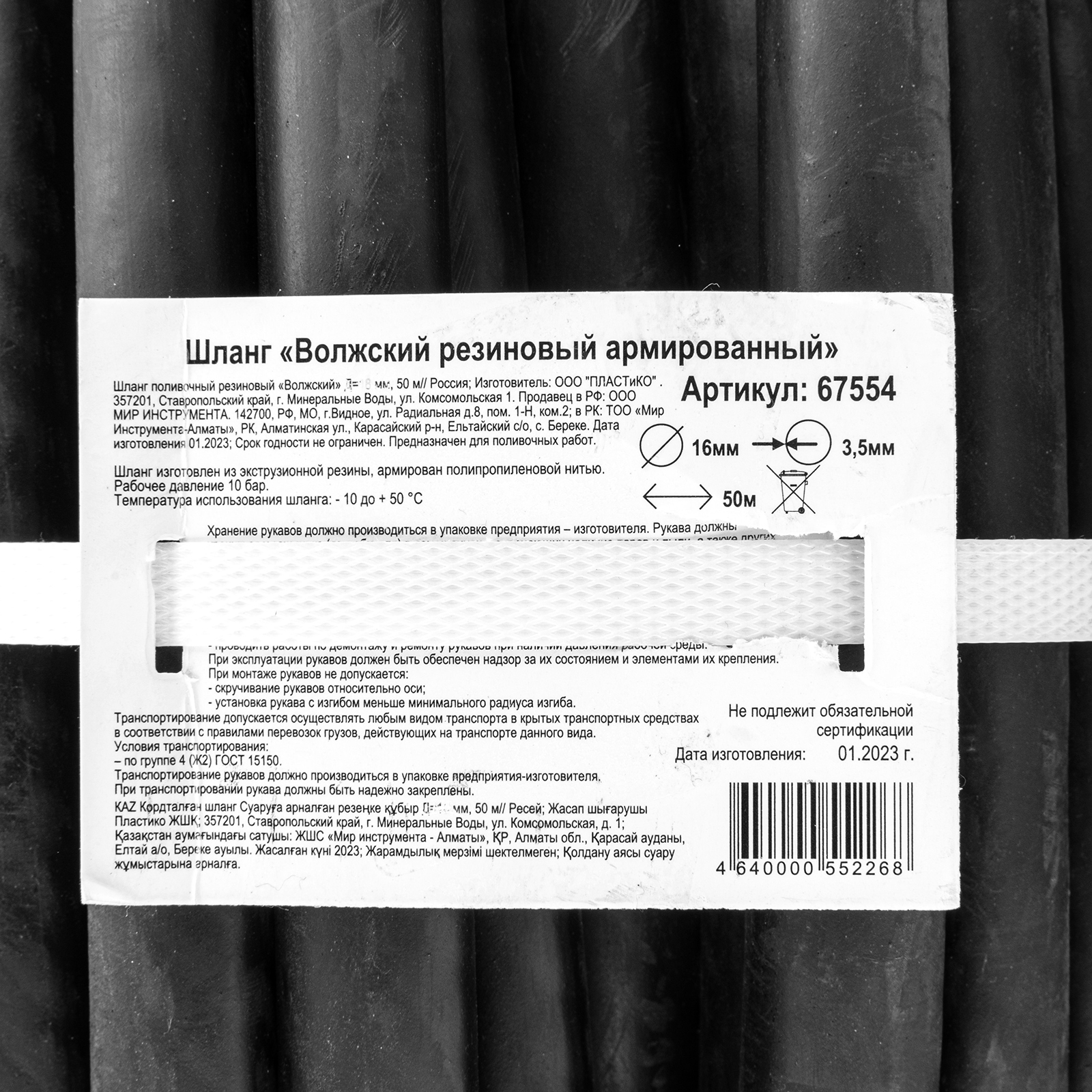 <p>Резиновый поливочный шланг (кордовый рукав) 67554 длиной 50 м и диаметром 16 мм пригодится на даче или приусадебном участке для организации системы полива и транспортировки жидкостей. Длина 50 метров оптимальна для больших территорий.</p><h2>Преимущества</h2><ul><li>Прочность и эластичность — шланг имеет нитяной кордовый каркас, а внутри и снаружи — резиновый слой.</li><li>Стойкость к нагрузкам — шланг со стенками толщиной 3,2 мм выдерживает давление до 8 бар.</li><li>Безопасность для окружающей среды — в составе шланга нет вредных веществ.</li><li>Неприхотливость — изделие может использоваться как в мороз, так и в жару (выдерживает от -40 до +90 °С).</li></ul>