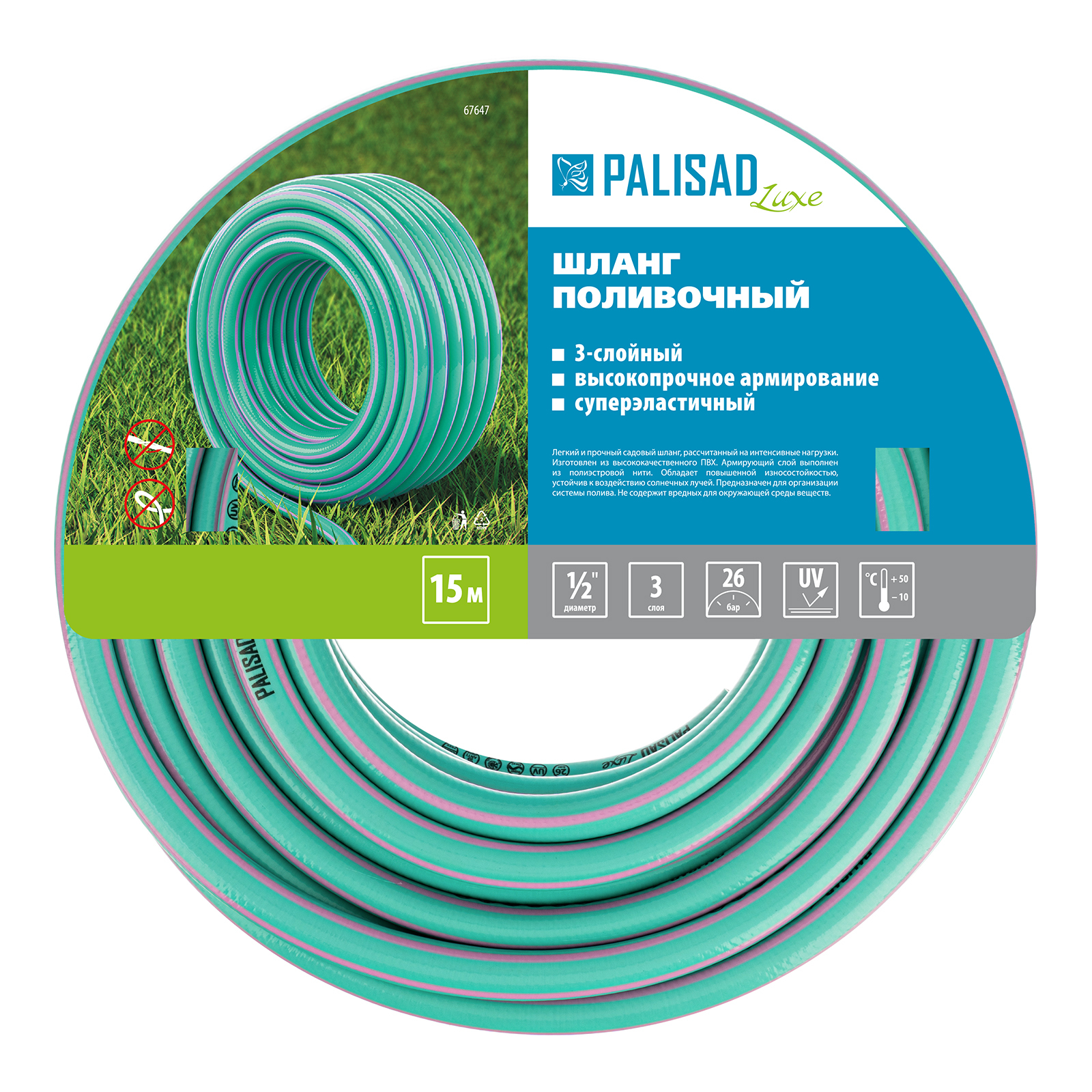 <p>Шланг поливочный армированный 3-слойный Palisad LUXE 67647 диаметром 1/2" и длиной 15 м — незаменимый помощник для садоводов. Используется для ручного или автоматического орошения растений. Совместим со всеми поливочными системами ТМ Palisad.</p><h2>Преимущества</h2><ul><li>Прочность — при изготовлении использован высококачественный поливинилхлорид (ПВХ).</li><li>Безопасность для окружающей среды — поливинилхлорид не содержит вредных веществ.</li><li>Высокий ресурс — шланг армирован суперпрочной полиэстерной нитью с инновационным плетением, способствующим равномерному распределению нагрузки.</li><li>Долговечность — защитное покрытие обеспечивает устойчивость к УФ-лучам и механическим повреждениям.</li></ul>