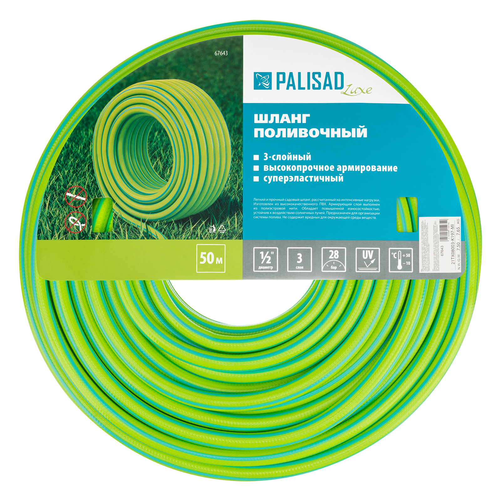<p>Шланг поливочный армированный 3-слойный Palisad LUXE 67643 диаметром 1/2" и длиной 50 м — незаменимый помощник для садоводов. Используется для ручного или автоматического орошения растений. Совместим со всеми поливочными системами ТМ Palisad.</p><h2>Преимущества</h2><ul><li>Прочность — при изготовлении использован высококачественный поливинилхлорид (ПВХ).</li><li>Безопасность для окружающей среды — поливинилхлорид не содержит вредных веществ.</li><li>Высокий ресурс — шланг армирован суперпрочной полиэстерной нитью с инновационным плетением, способствующим равномерному распределению нагрузки.</li><li>Долговечность — защитное покрытие обеспечивает устойчивость к УФ-лучам и механическим повреждениям.</li></ul>