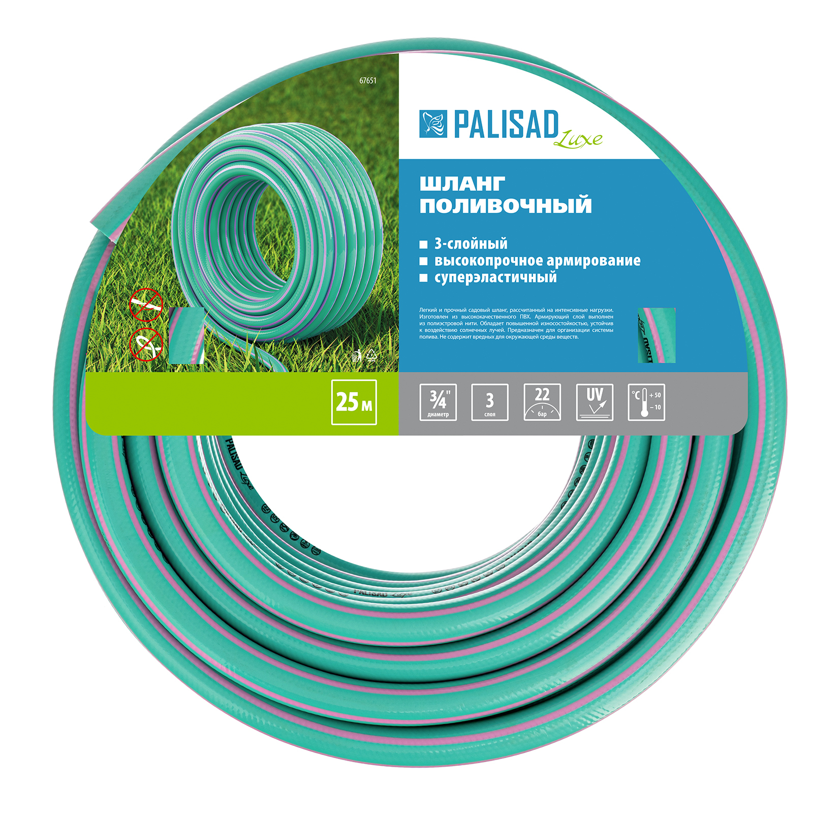 <p>Шланг поливочный армированный 3-слойный Palisad LUXE 67651 диаметром 3/4" и длиной 25 м — незаменимый помощник для садоводов. Используется для ручного или автоматического орошения растений. Совместим со всеми поливочными системами ТМ Palisad.</p><h2>Преимущества</h2><ul><li>Прочность — при изготовлении использован высококачественный поливинилхлорид (ПВХ).</li><li>Безопасность для окружающей среды — поливинилхлорид не содержит вредных веществ.</li><li>Высокий ресурс — шланг армирован суперпрочной полиэстерной нитью с инновационным плетением, способствующим равномерному распределению нагрузки.</li><li>Долговечность — защитное покрытие обеспечивает устойчивость к УФ-лучам и механическим повреждениям.</li></ul>