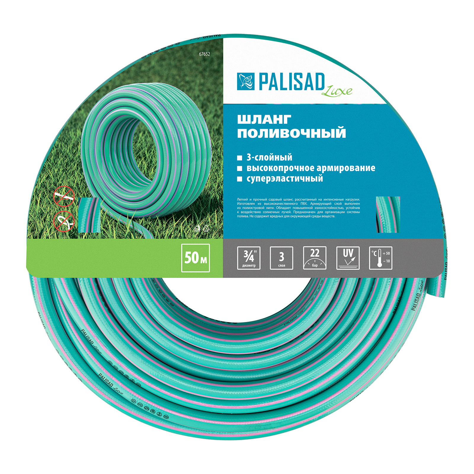 <p>Шланг поливочный армированный 3-слойный Palisad LUXE 67652 диаметром 3/4" и длиной 50 м — незаменимый помощник для садоводов. Используется для ручного или автоматического орошения растений. Совместим со всеми поливочными системами ТМ Palisad.</p><h2>Преимущества</h2><ul><li>Прочность — при изготовлении использован высококачественный поливинилхлорид (ПВХ).</li><li>Безопасность для окружающей среды — поливинилхлорид не содержит вредных веществ.</li><li>Высокий ресурс — шланг армирован суперпрочной полиэстерной нитью с инновационным плетением, способствующим равномерному распределению нагрузки.</li><li>Долговечность — защитное покрытие обеспечивает устойчивость к УФ-лучам и механическим повреждениям.</li></ul>