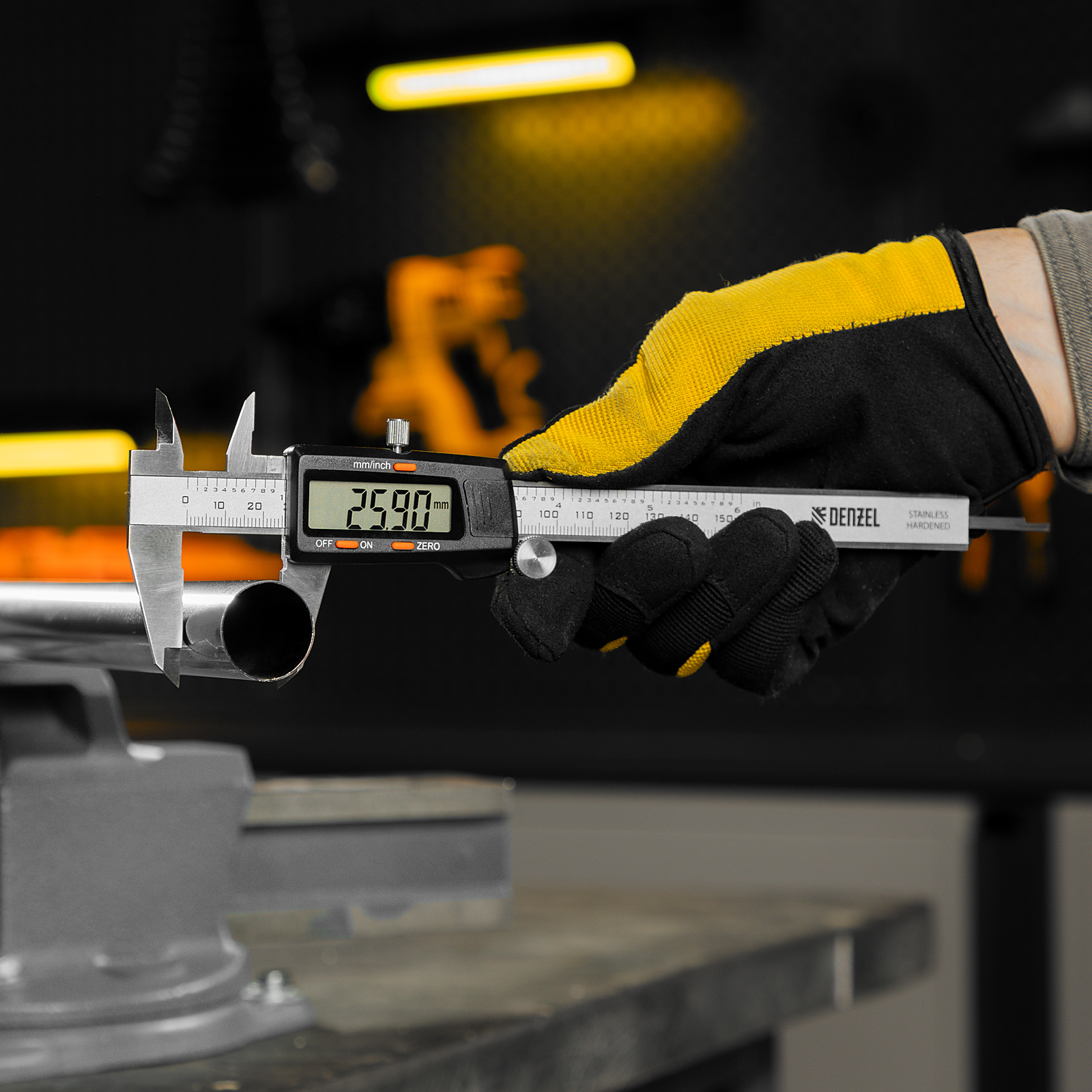 Электронный штангенциркуль Denzel 31613 со шкалой длиной 150 мм и глубиномером позволяет определять внутренние и внешние размеры различных деталей. Цена деления составляет 0,01 мм. Штангенциркуль позволяет получать результаты высокой точности: погрешность составляет ±0,02 мм при измерении размеров до 100 мм, и ±0,03 мм — до 150 мм. Двустороннее положение губок облегчает проведение работ. Инструмент пригодится на производстве, в мастерской, гараже, а также будет полезен в быту.