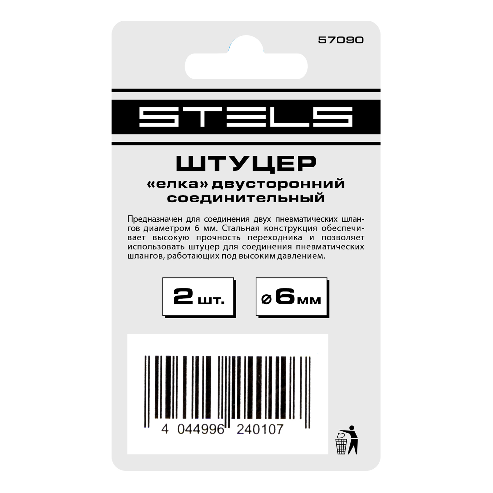 Двусторонний соединительный штуцер Stels 57090 типа «елка», 2 шт. в упаковке, предназначен для соединения пневматических шлангов диаметром 6 мм. Используется для монтажа пневмолиний и работы с пневмоинструментом.