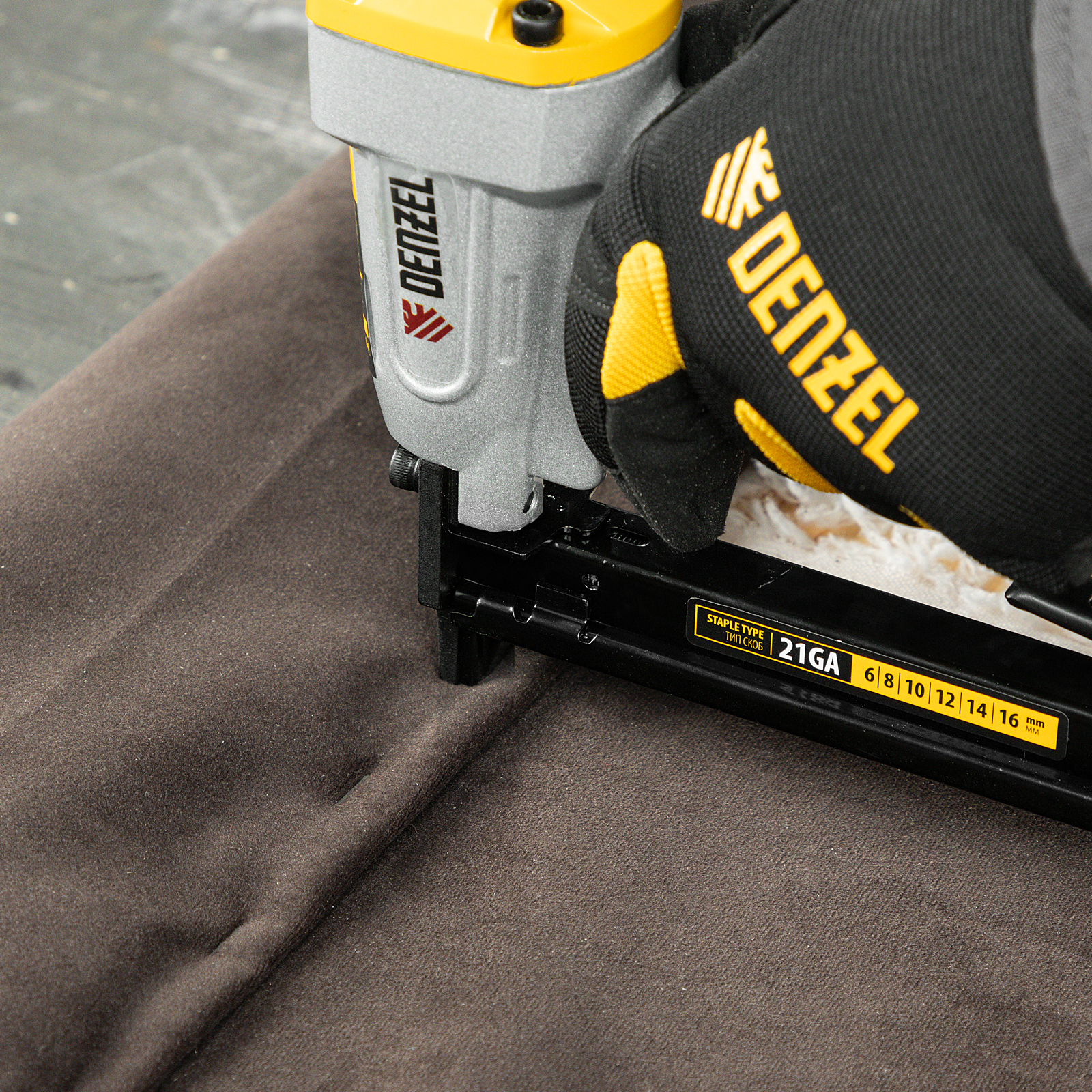 Скобы 21GA Denzel 57672 шириной 12,8 мм, 5000 шт. в упаковке, предназначены для пневматического степлера, совместимого с крепежом размера 8 х 0,95 х 0,6 мм. Используются для крепления листовых материалов к деревянному основанию, подходят для обивки мебели, укладки напольного покрытия, фиксации утеплителя.