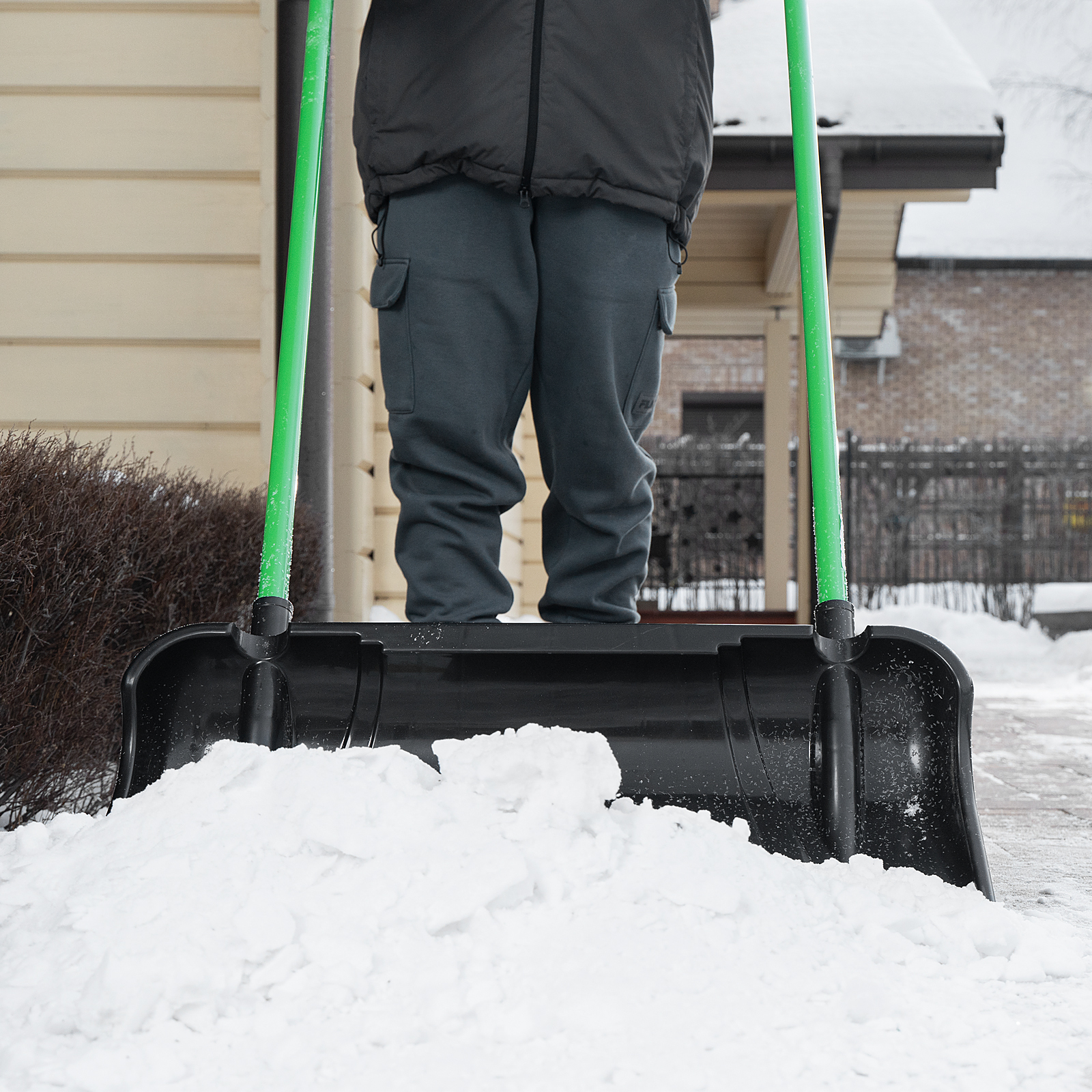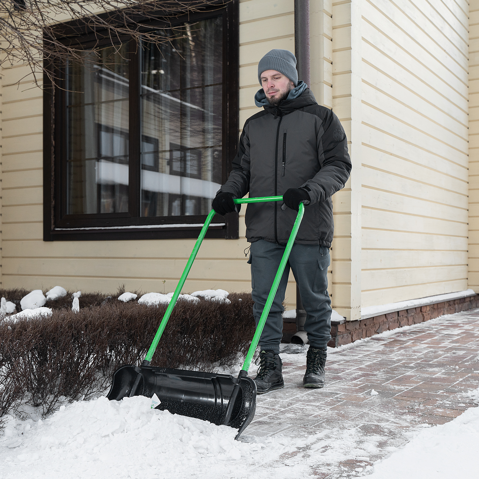 Скрепер Palisad BASE 61689 размером 710 х 320 х 1325 мм, с ковшом из полипропилена и стальной усиленной рукояткой, применяется для уборки снега на дачном участке, придомовой территории, для расчистки пространства около гаража, подъезда и т. д. Инструмент значительно повышает скорость работы, позволяя быстро убирать снег с больших поверхностей.