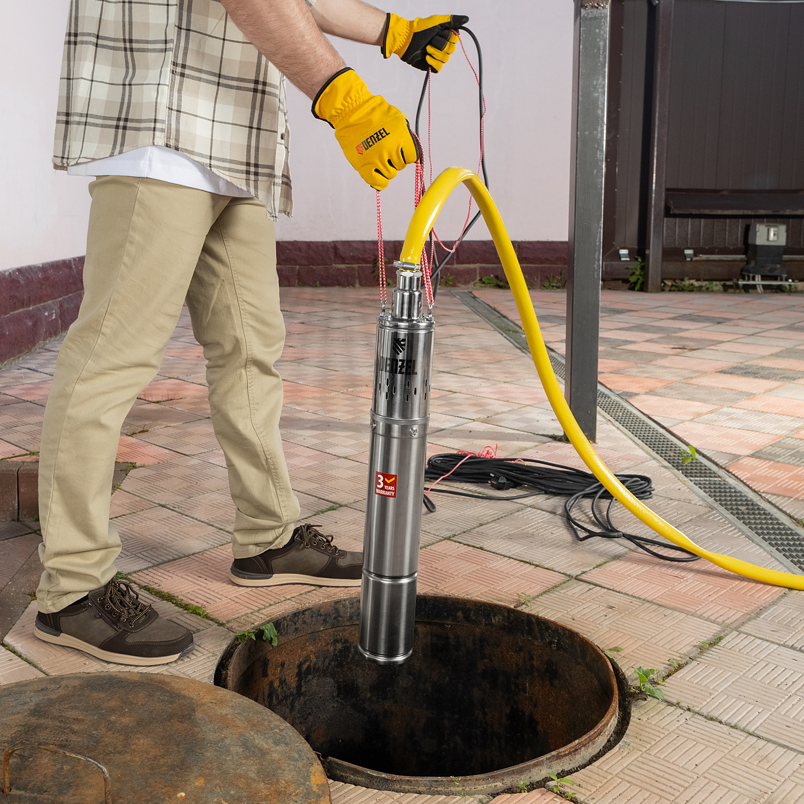 - Простая установка — в верхней части корпуса имеются проушины для закрепления троса, при помощи которого насос погружается в воду.