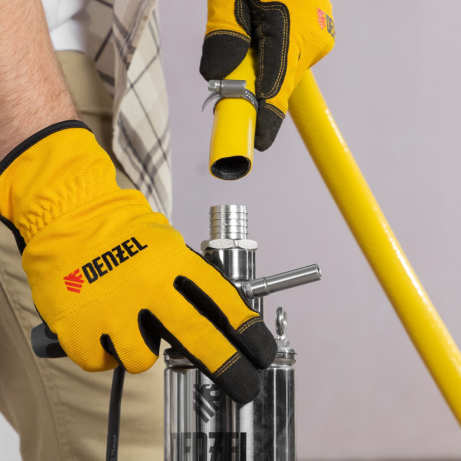 Винтовой скважинный насос Denzel DWS-3,5-100 97251 диаметром 3,5" потребляет мощность 800 Вт, перекачивает воду объемом 1700 л/ч и обеспечивает напор до 100 м при рабочем давлении 10 бар. Предназначен для подъема чистой воды с глубины до 80 м из скважин и колодцев, различных резервуаров и водоемов. Используется для организации систем водоснабжения и орошения на даче, садовом участке или в загородном доме.