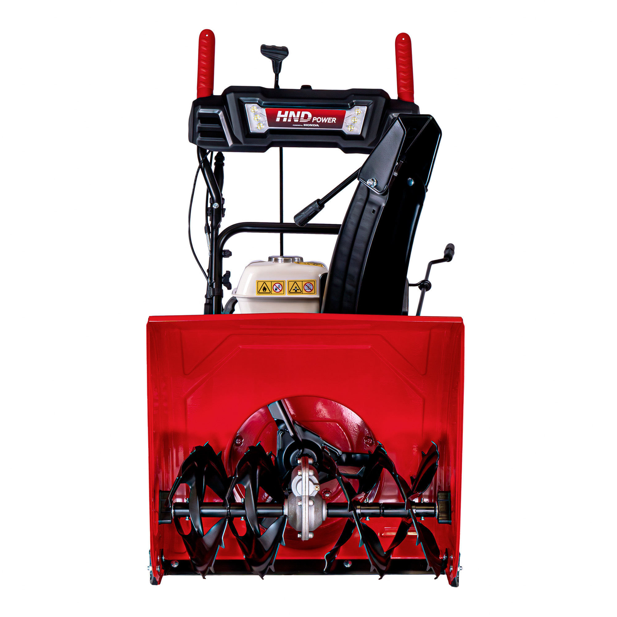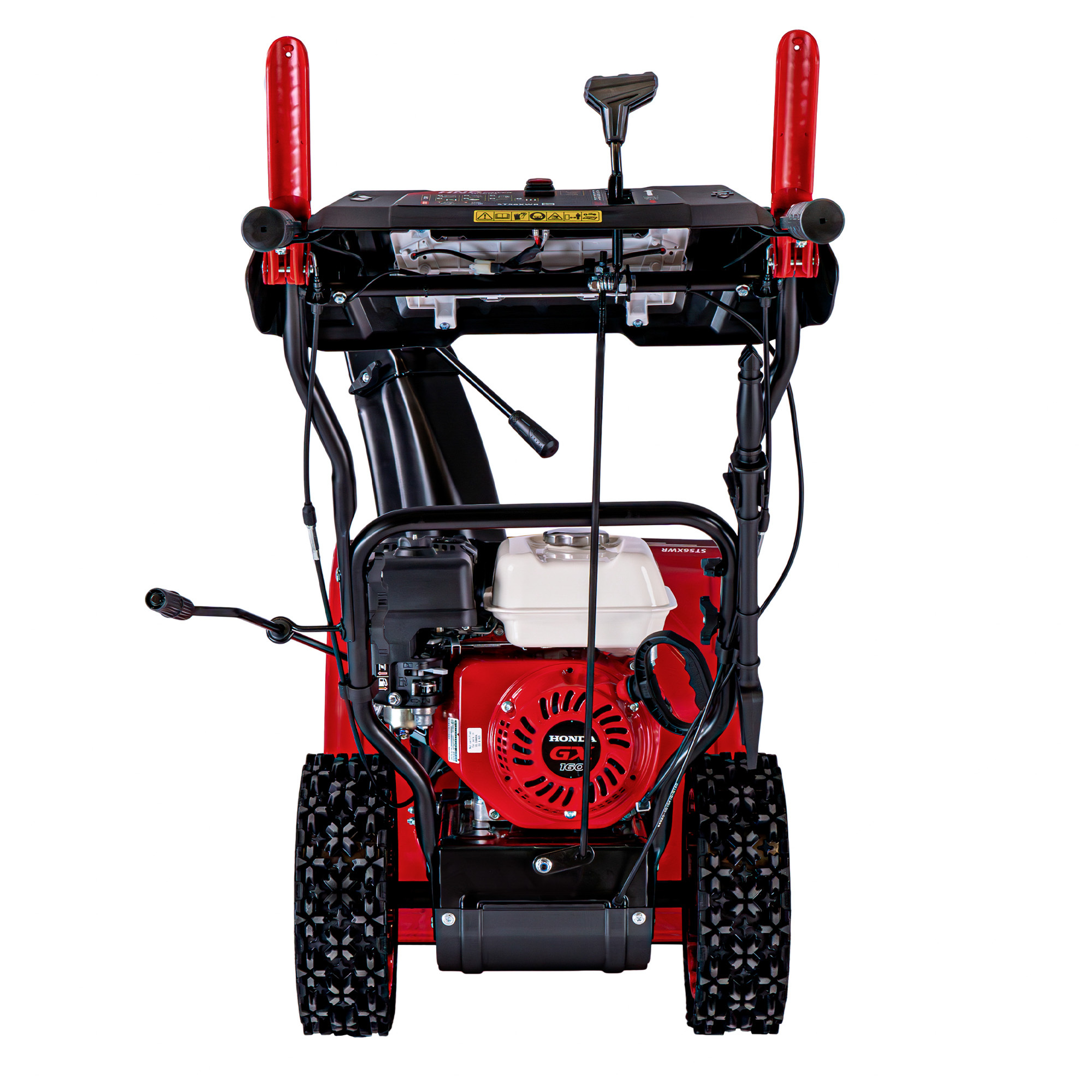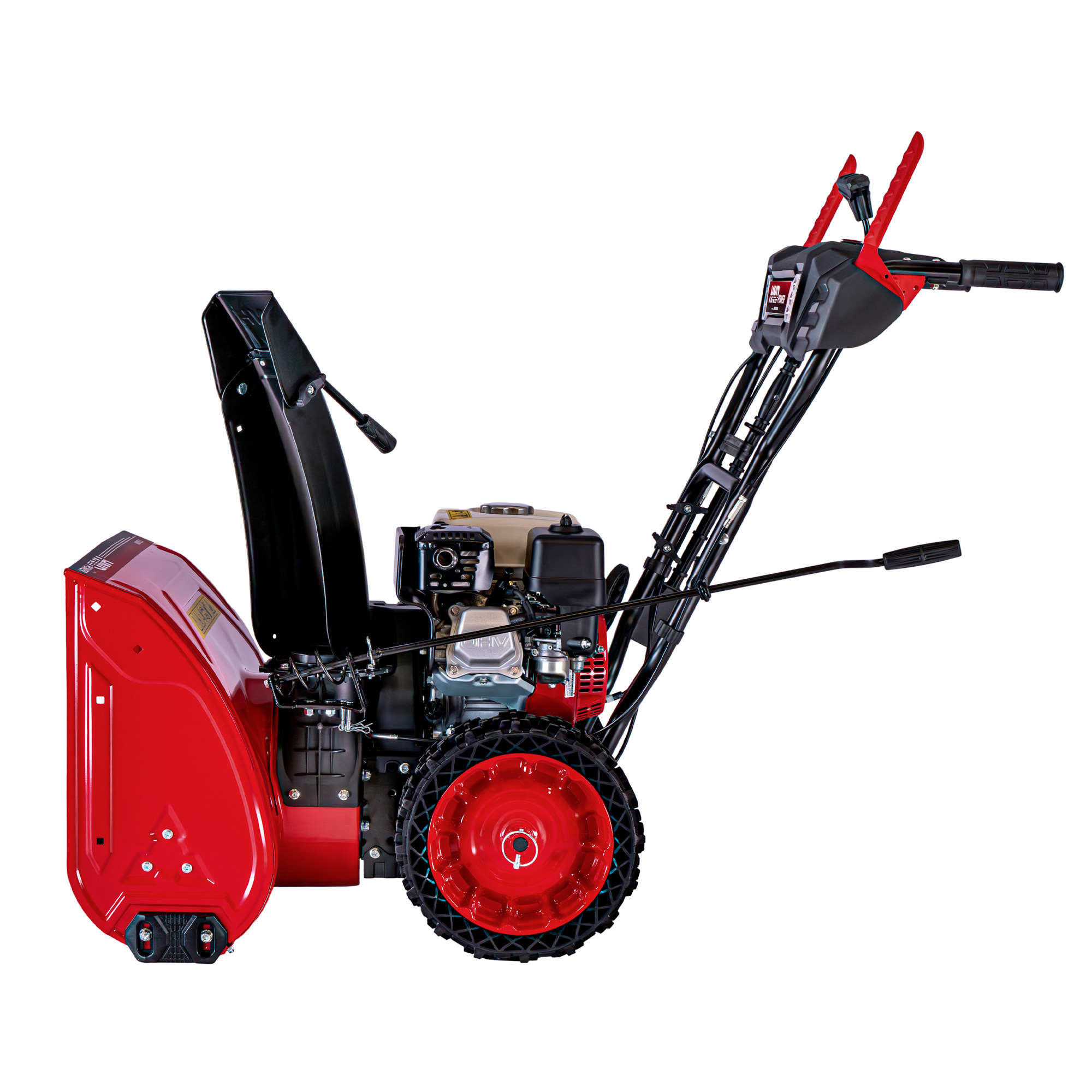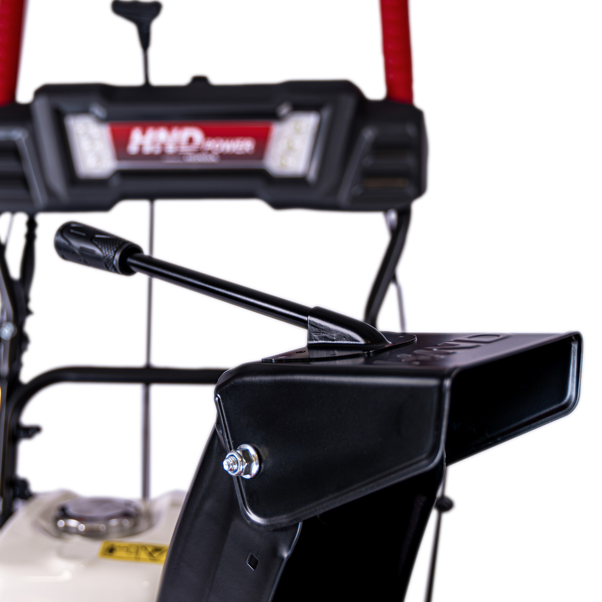Снегоуборщик оснащён безвоздушными шинами размером 13" x 4.1-9.5in. Регулировка положения снегозаборника не предусмотрена. Управление поворотом желоба выброса снега осуществляется с помощью бокового рычага, а угол наклона выброса снега регулируется на самом желобе. Панель управления выполнена из пластика, а ручки имеют обогрев.