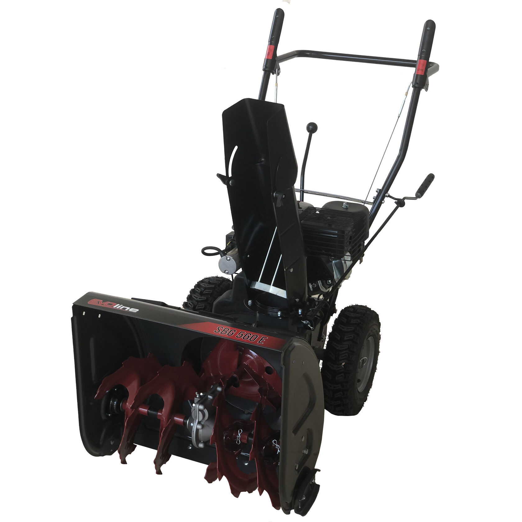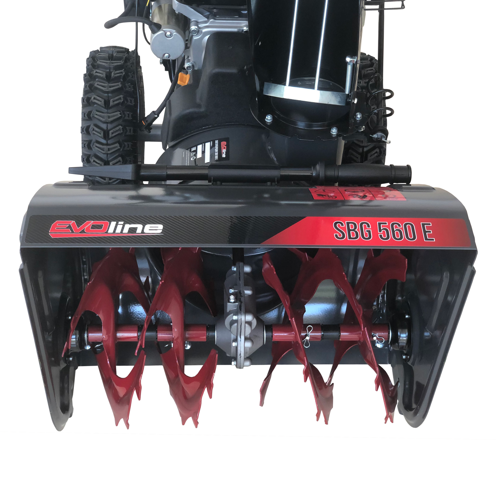 Самоходная модель EVOline SBG560E, в стандартной комплектации, представлена с легким запуском двигателя от розетки 220В, LED-фарой, трансмиссией с 5 передними и 2 задними передачами и колесами с зимнем протектором.