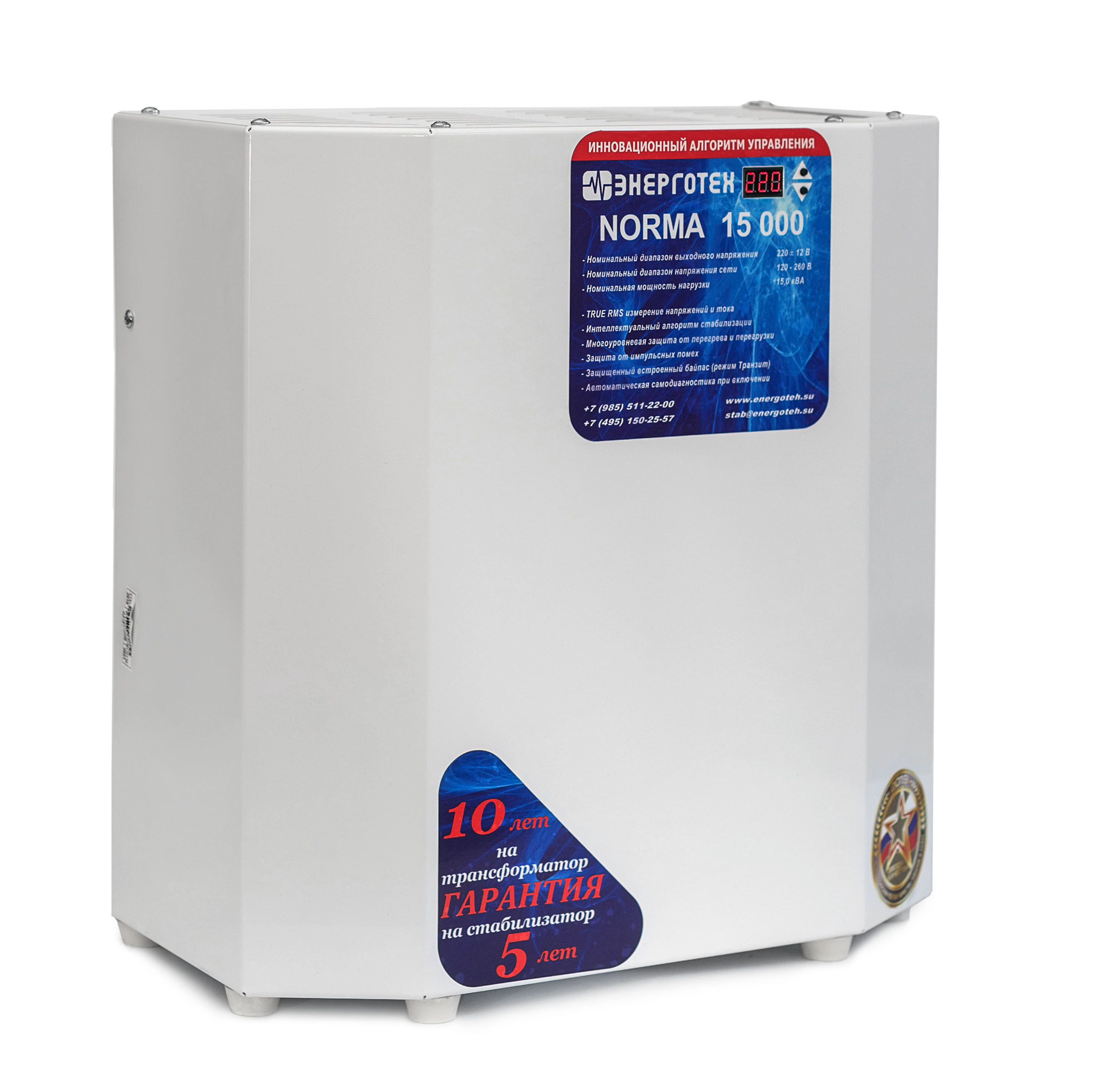 NORMA является начальной серией стабилизатор напряжения Энерготех. Она представлена бюджетными электронными тиристорными стабилизаторами с точностью стабилизации 5,7%, используются 9 ступеней. Эта серия работает при входном напряжении 130-310 В. При входном напряжении от 150 до 300 В прибор обеспечивает заявленную точность стабилизации и мощность подключенной нагрузки. Серия Норма может работать в неотапливаемом помещении при температуре от -25 до +45 °С. В комплекте идет специальная подставка для размещения стабилизатора напряжения на стене. Снизу расположены автоматический выключатель и ручной сервисный байпас.