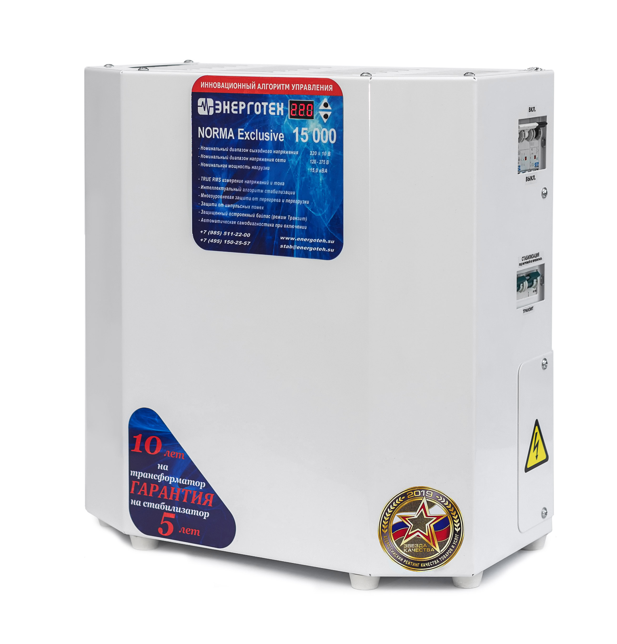 NORMA является начальной серией стабилизатор напряжения Энерготех. Она представлена бюджетными электронными тиристорными стабилизаторами с точностью стабилизации 4,8%, используются 12 ступеней. Эта серия работает при входном напряжении 105-285 В. При входном напряжении от 120 до 275 В прибор обеспечивает заявленную точность стабилизации и мощность подключенной нагрузки. Серия Норма может работать в неотапливаемом помещении при температуре от -25 до +45 °С. В комплекте идет специальная подставка для размещения стабилизатора напряжения на стене. Снизу расположены автоматический выключатель и ручной сервисный байпас.