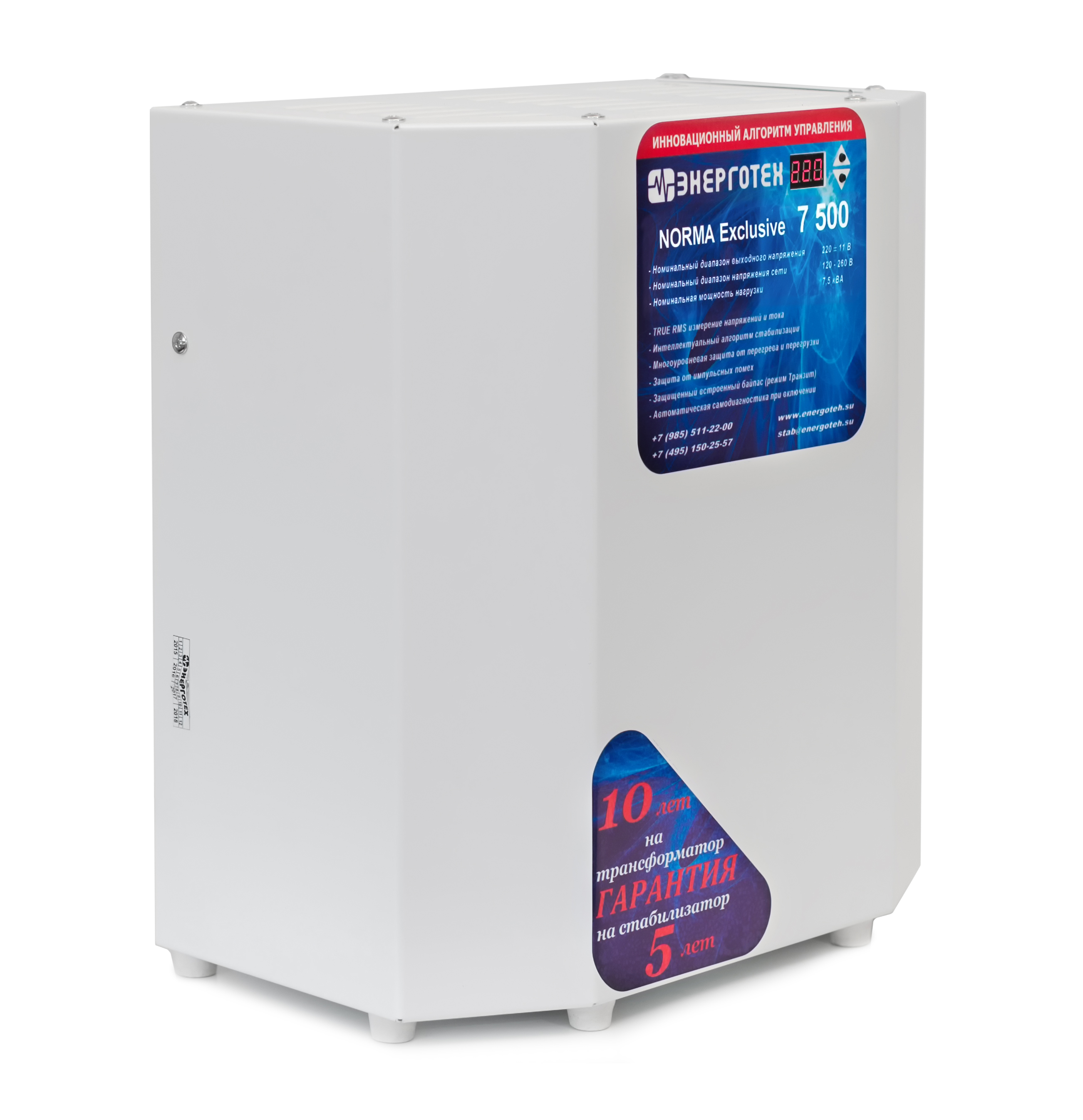 NORMA является начальной серией стабилизатор напряжения Энерготех. Она представлена бюджетными электронными тиристорными стабилизаторами с точностью стабилизации 4,8%, используются 12 ступеней. Эта серия работает при входном напряжении 105-285 В. При входном напряжении от 120 до 275 В прибор обеспечивает заявленную точность стабилизации и мощность подключенной нагрузки. Серия Норма может работать в неотапливаемом помещении при температуре от -25 до +45 °С. В комплекте идет специальная подставка для размещения стабилизатора напряжения на стене. Снизу расположены автоматический выключатель и ручной сервисный байпас.