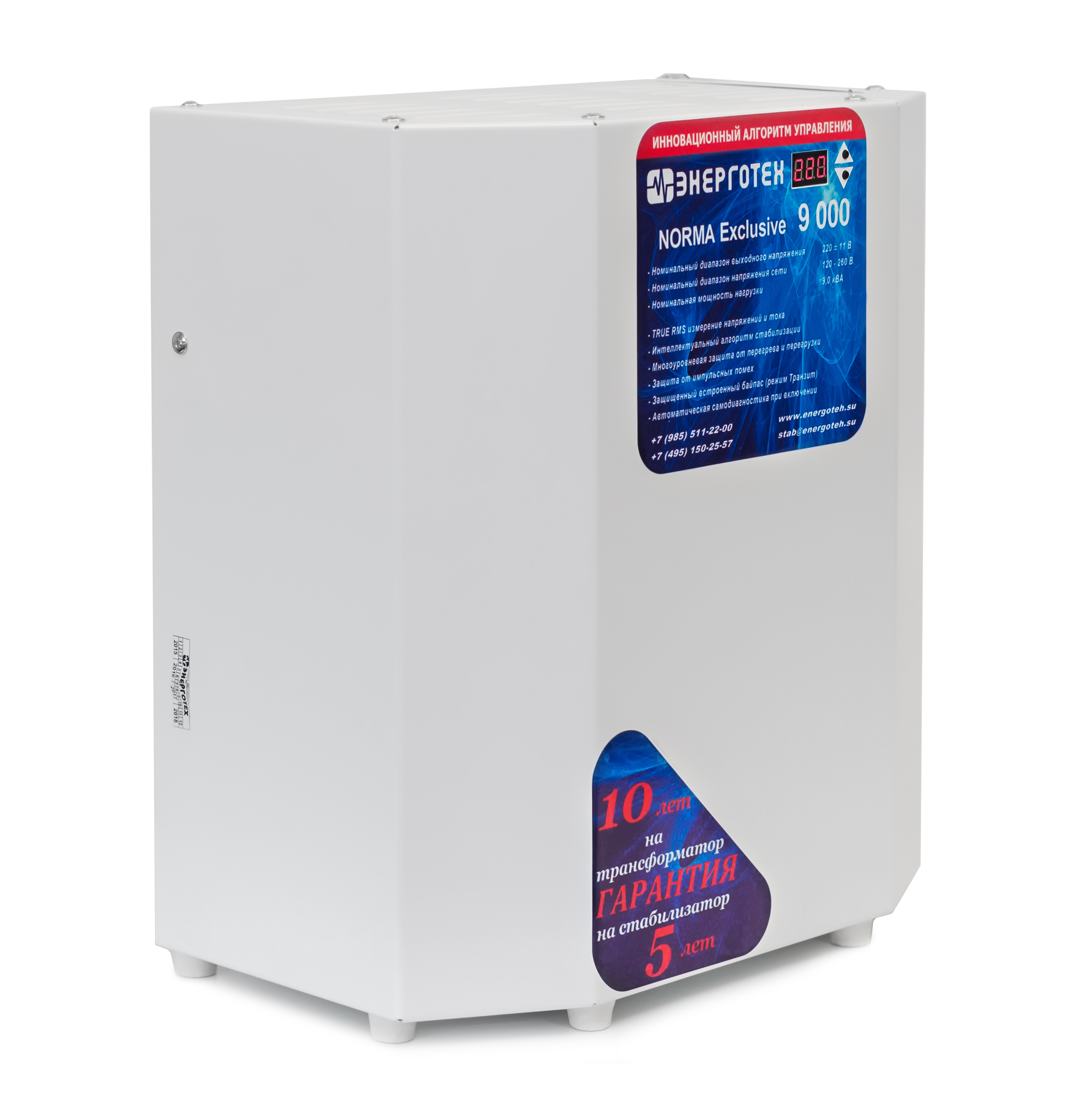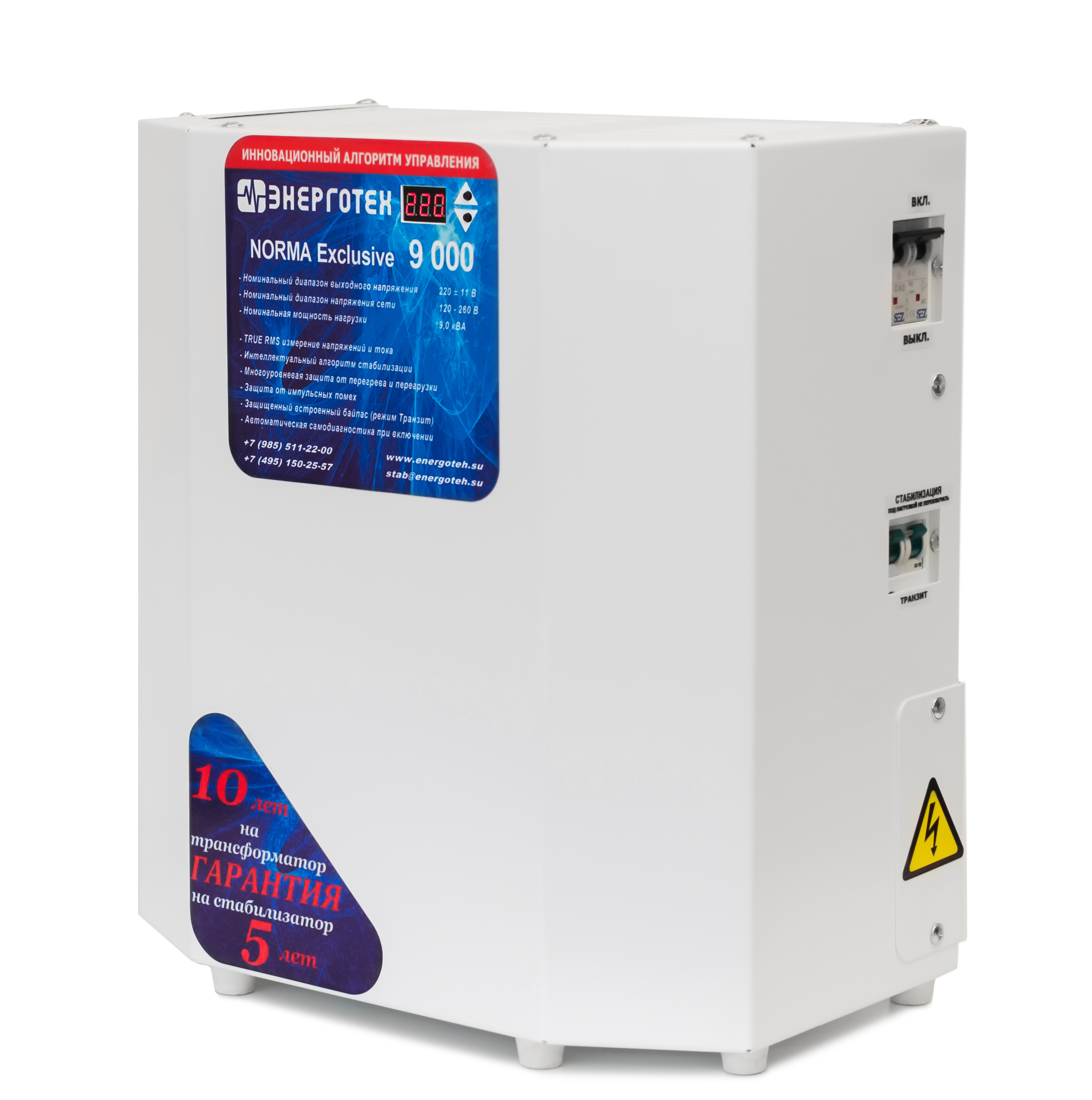 NORMA является начальной серией стабилизатор напряжения Энерготех. Она представлена бюджетными электронными тиристорными стабилизаторами с точностью стабилизации 4,8%, используются 12 ступеней. Эта серия работает при входном напряжении 105-285 В. При входном напряжении от 120 до 275 В прибор обеспечивает заявленную точность стабилизации и мощность подключенной нагрузки. Серия Норма может работать в неотапливаемом помещении при температуре от -25 до +45 °С. В комплекте идет специальная подставка для размещения стабилизатора напряжения на стене. Снизу расположены автоматический выключатель и ручной сервисный байпас.