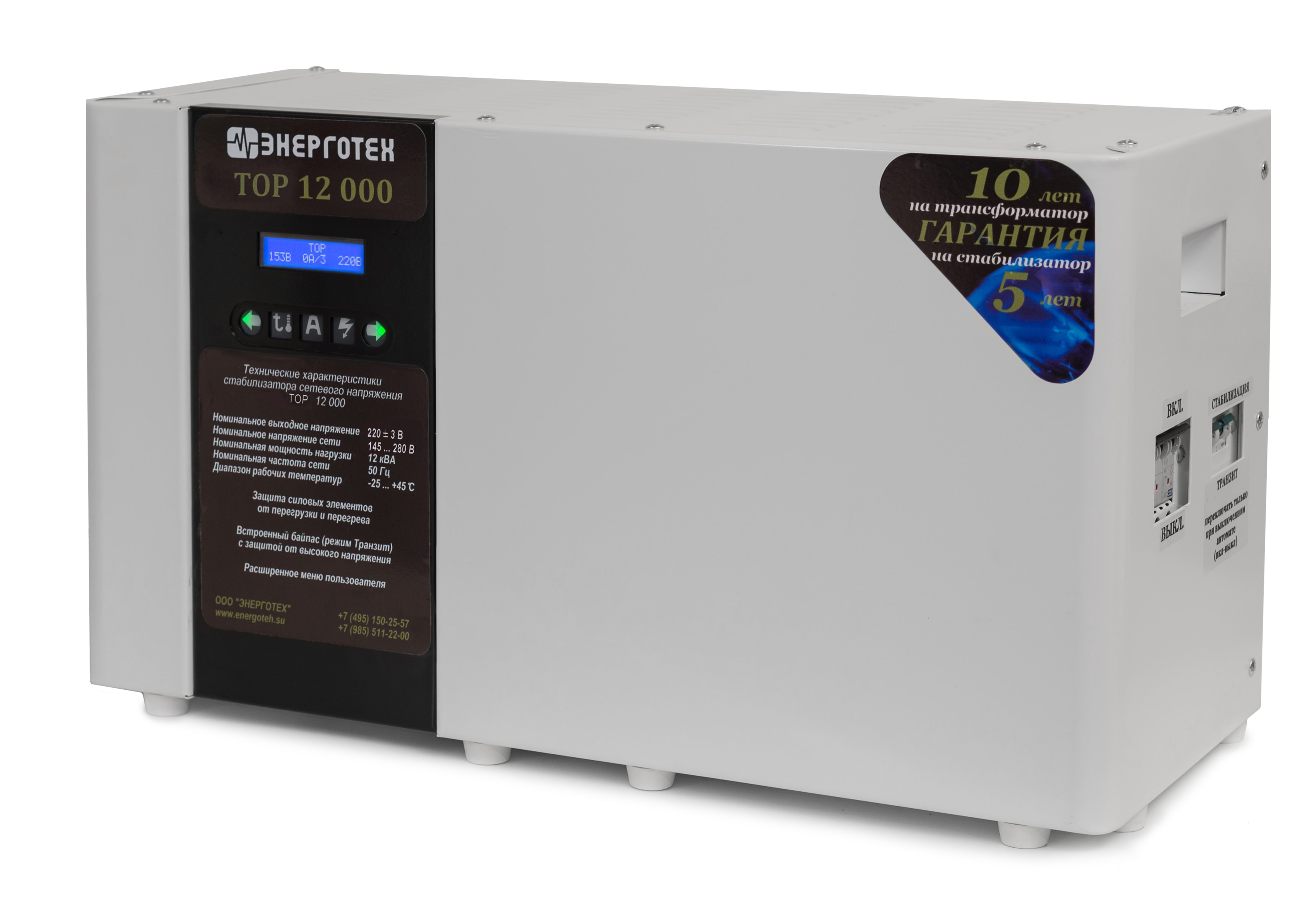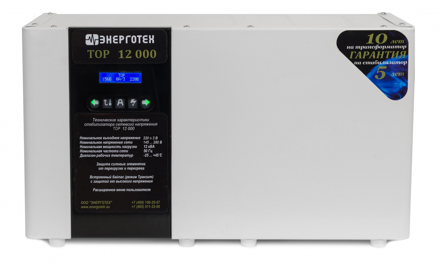 Серия TOP это самая последняя разработка компании Энерготех. Ее легко отличить по другому дизайну корпуса, он достаточно узкий и обладает закругленными углами. Такой стабилизатор легко разместить в тесных коридорах и котельных комнатах.