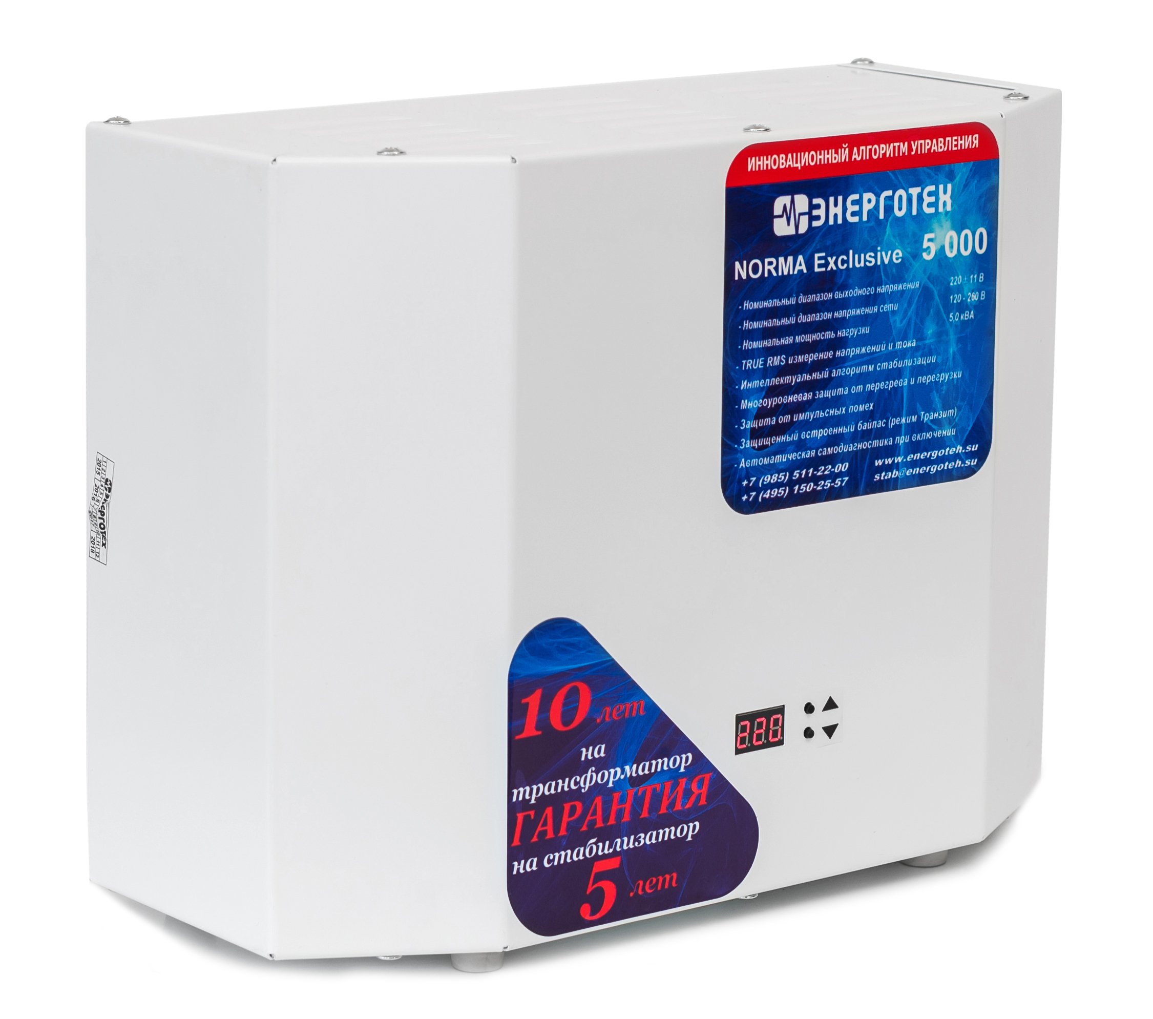 NORMA является начальной серией стабилизатор напряжения Энерготех. Она представлена бюджетными электронными тиристорными стабилизаторами с точностью стабилизации 4,8%, используются 12 ступеней. Эта серия работает при входном напряжении 105-285 В. При входном напряжении от 120 до 275 В прибор обеспечивает заявленную точность стабилизации и мощность подключенной нагрузки. Серия Норма может работать в неотапливаемом помещении при температуре от -25 до +45 °С. В комплекте идет специальная подставка для размещения стабилизатора напряжения на стене. Снизу расположены автоматический выключатель и ручной сервисный байпас.