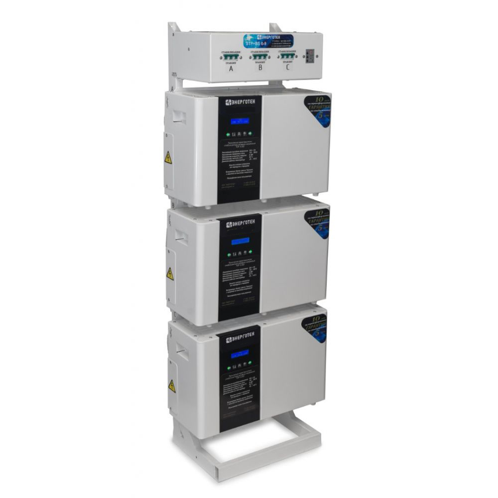 Это трехфазный стабилизатор напряжения состоящий из трех однофазных блоков скоммутированных на стойке.