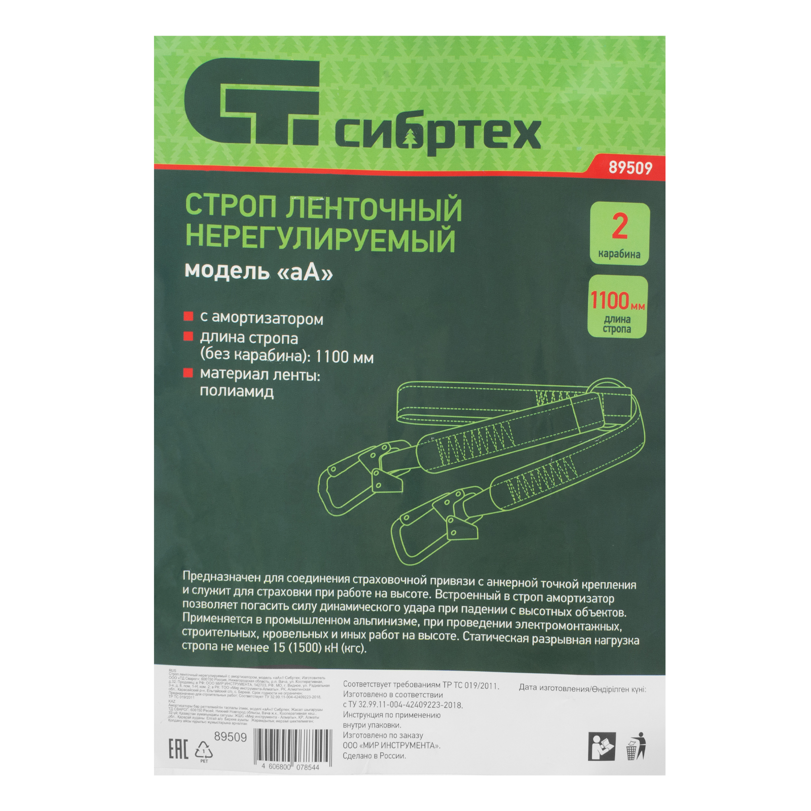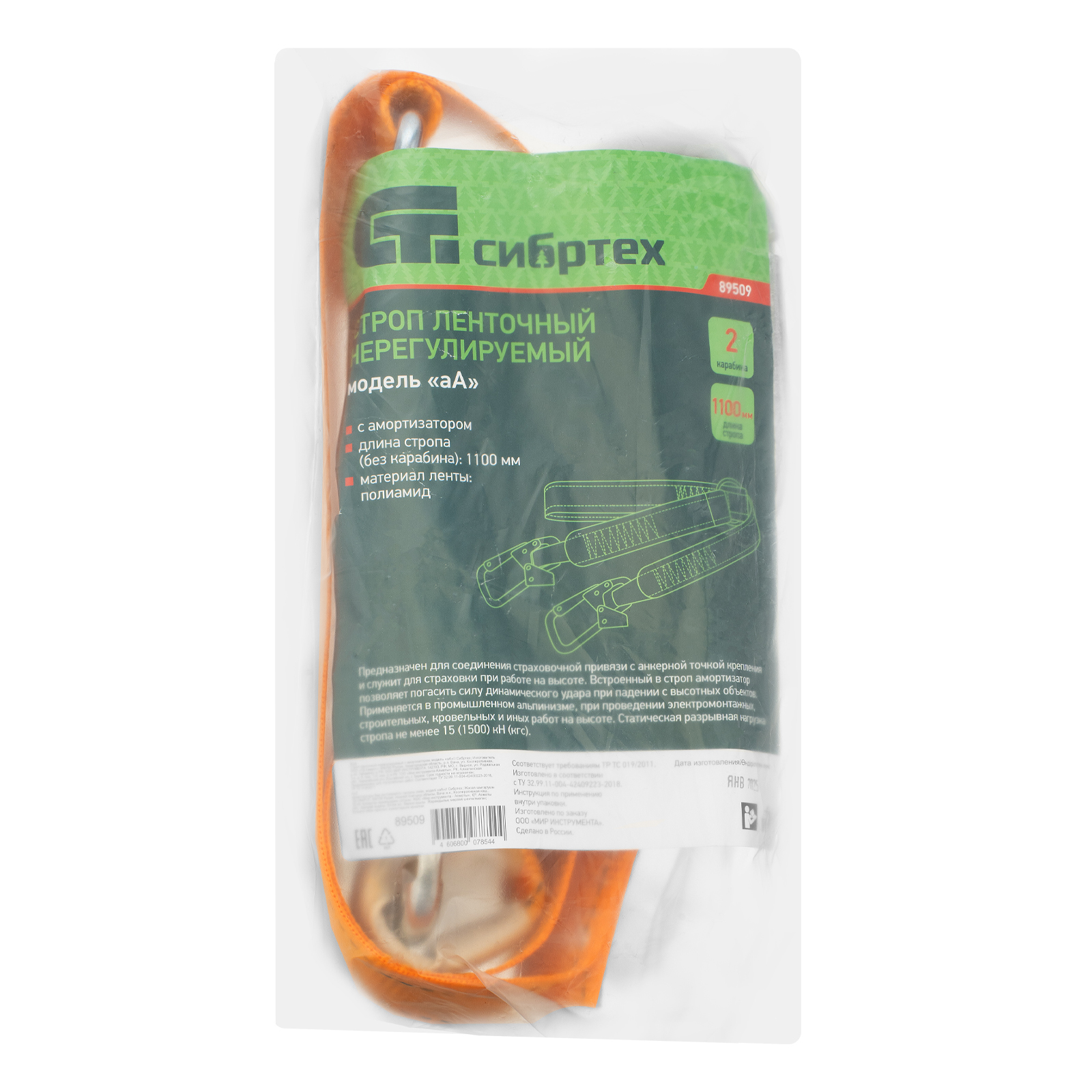 <p>Ленточный нерегулируемый строп Сибртех 89509, модель «аА» с амортизатором, предназначен для соединения удерживающей (страховочной) привязи с анкерной точкой крепления. Применятся в ходе строительных, монтажных кровельных и других операций, когда необходимо обеспечить безопасность работника. Применение без страховочно-удерживающей привязи недопустимо.</p><h2>Преимущества</h2><ul><li>Высокая прочность — строп из полиамидной ленты шириной 45 мм выдерживает статические нагрузки не менее 15 кН (1500 кгс).</li><li>Безопасная работа — два прочных стальных карабина гарантируют надежную фиксацию, встроенный амортизатор гасит силу динамического удара в случае падения пользователя с высоты.</li><li>Подтвержденное качество — лента изготовлена согласно требованиям, предъявляемым к средствам индивидуальной защиты по ТР ТС 019/2011, гарантийный срок составляет 2 года.</li></ul>