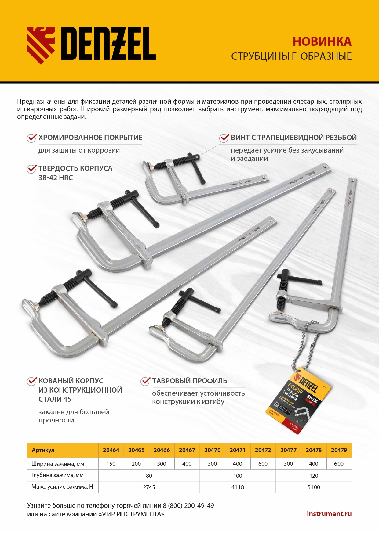 <p>Кованая F-образная струбцина Denzel 20471 с глубиной зажима 100 мм, усиленная, предназначена для фиксации деталей шириной до 400 мм и материалов при проведении слесарных, столярных и сварочных работ. Тавровый профиль обеспечивает устойчивость конструкции к изгибу, что позволяет фиксировать детали со значительным усилием. Струбцина подходит для профессионального применения.</p><h2>Преимущества</h2><ul><li>Корпус изготовлен из конструкционной стали 45 методом ковки и закален для большей прочности до твердости 38-42 HRC.</li><li>Винт с трапециевидной резьбой передает усилие без закусываний и заеданий.</li><li>Хромированное покрытие надежно защищает струбцину от коррозии.</li></ul>