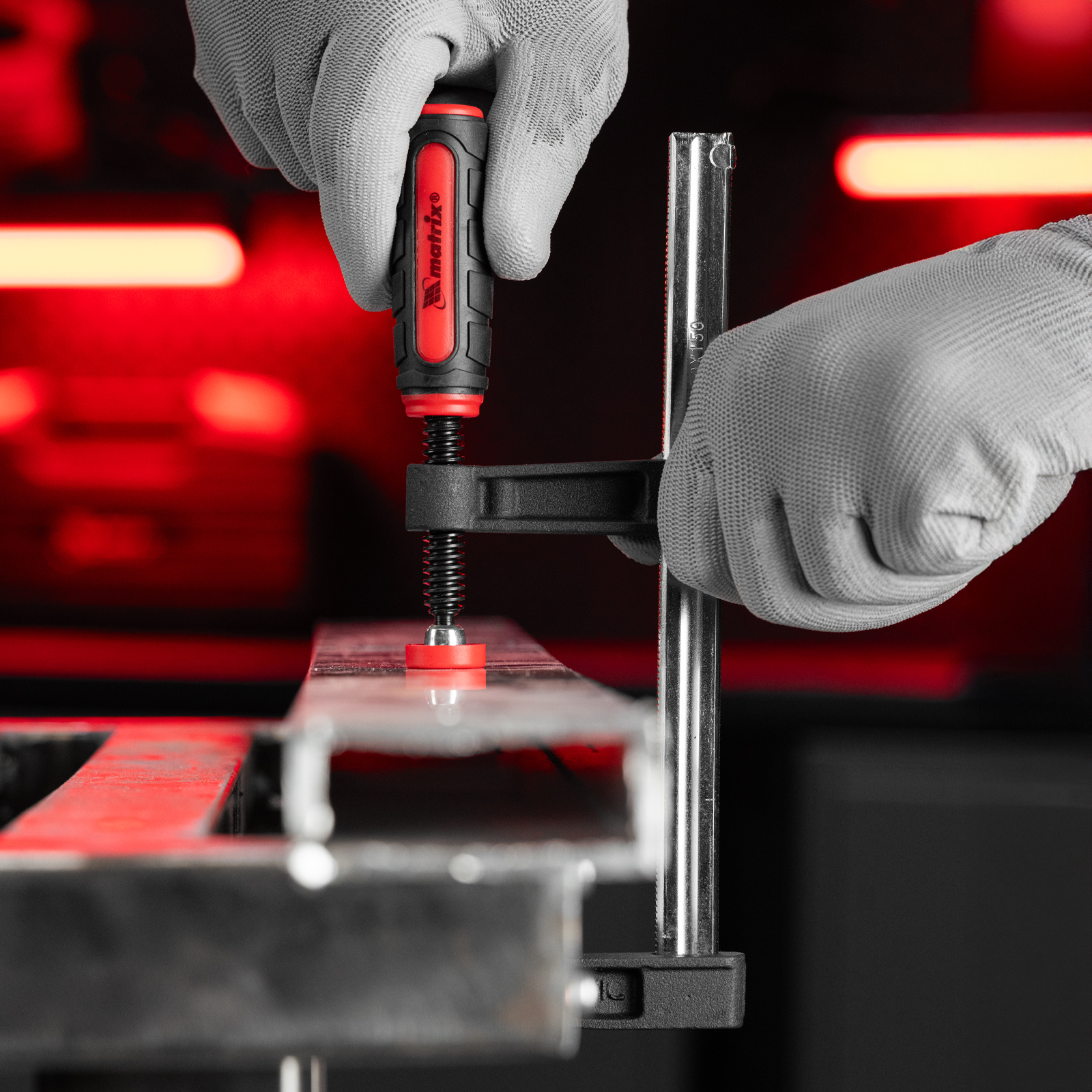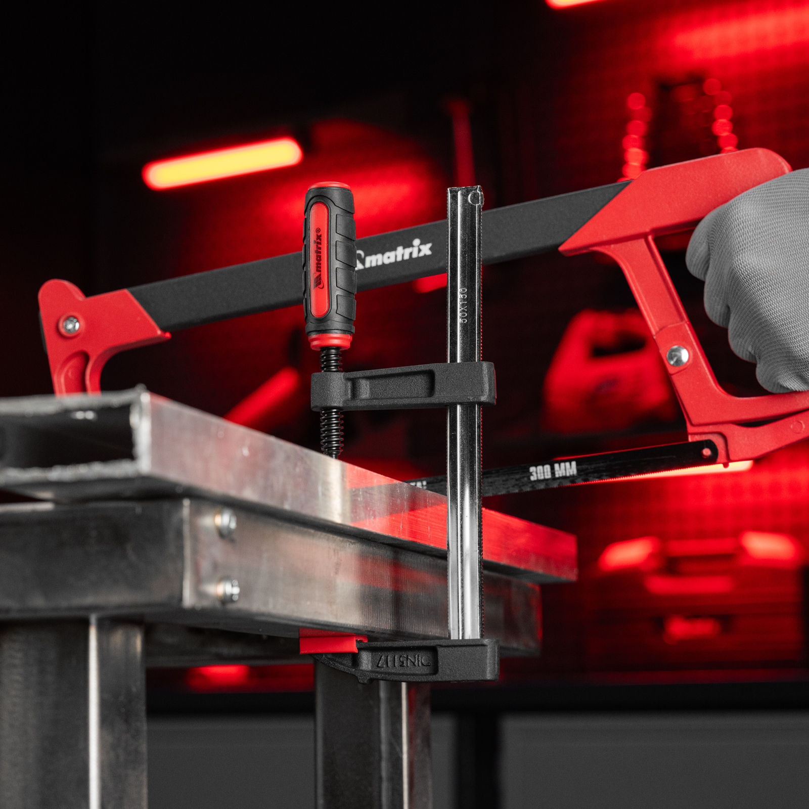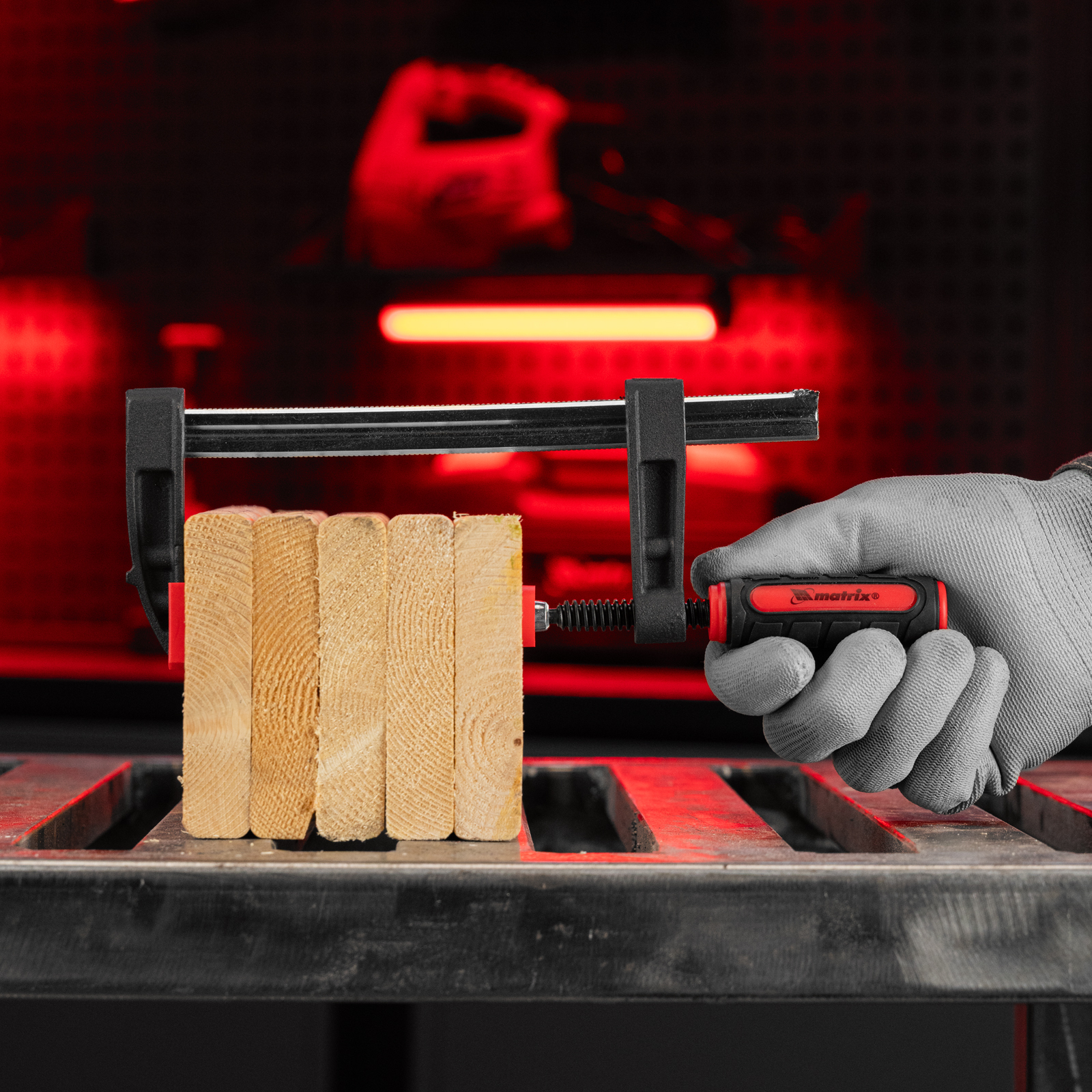 F-образная струбцина Matrix 20402 размером 150 х 50 х 210 мм используется для зажима металлических, деревянных и других заготовок для их последующей обработки или сборки. Представляет собой штангу, на которой установлено 2 кронштейна — неподвижный и подвижный. Деталь помещается между ними и прижимается к губкам при помощи винтового зажима с трапециевидной резьбой. Подвижный кронштейн позволяет регулировать величину захвата, которая может достигать 150 мм. Струбцину применяют для выполнения слесарных и столярных работ.