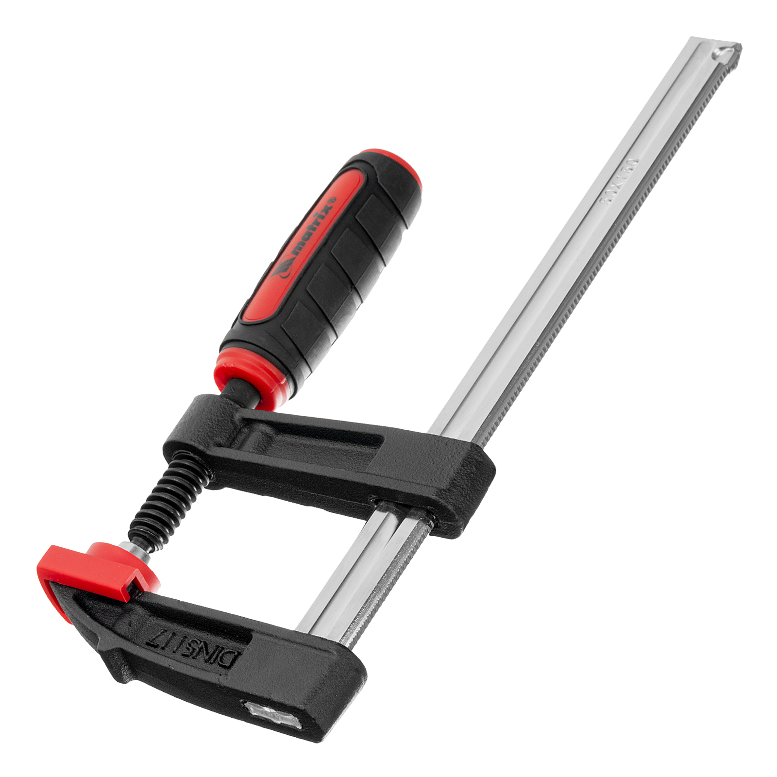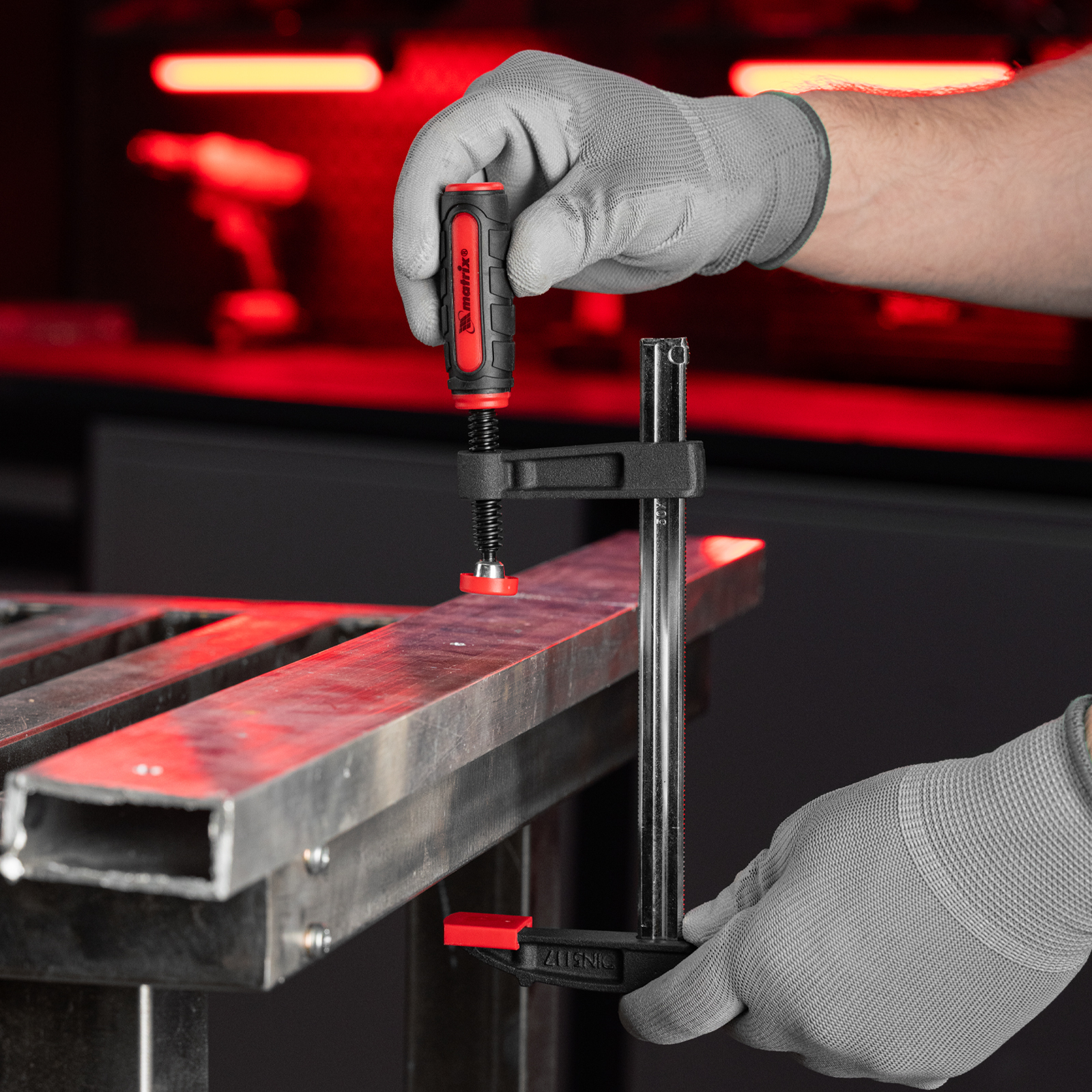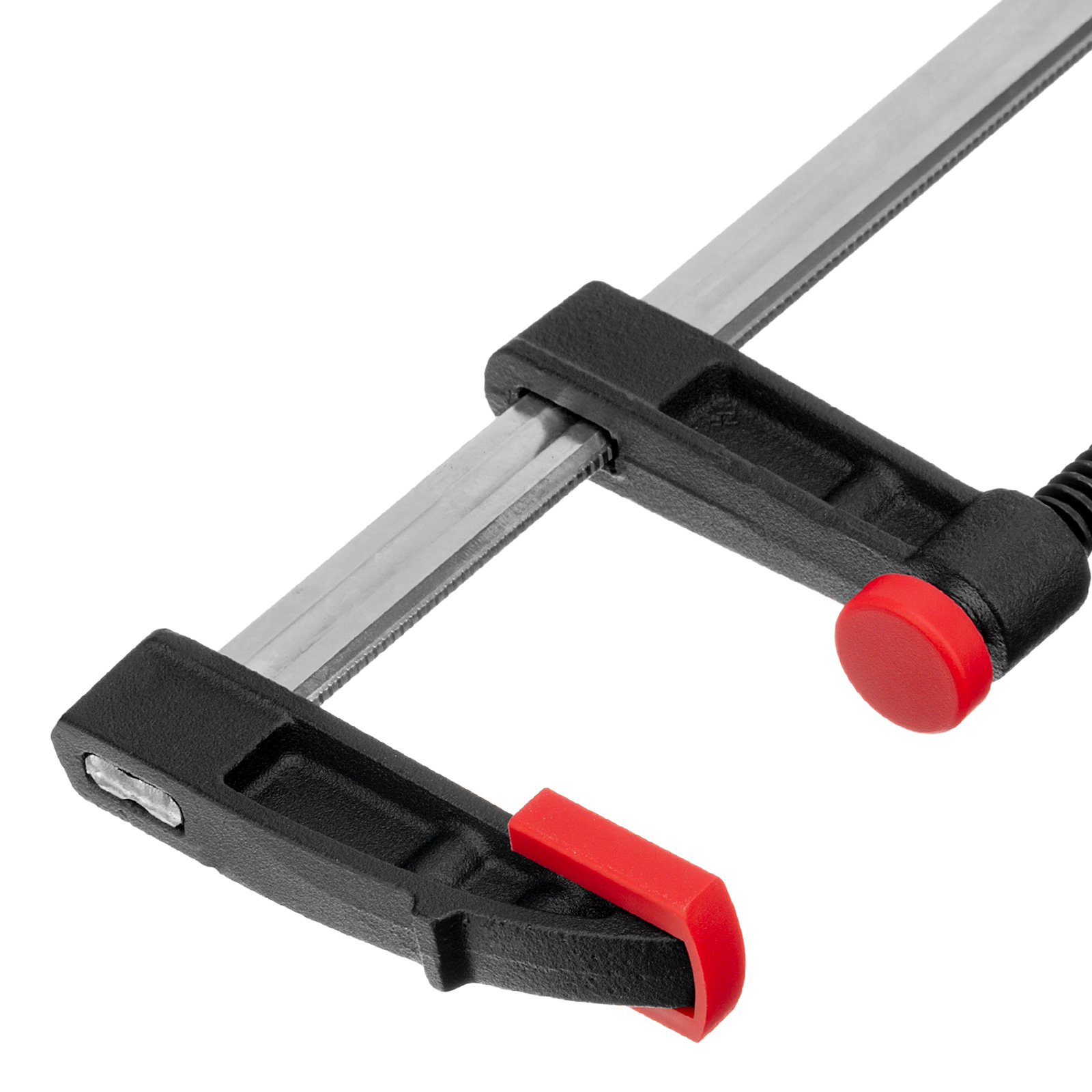 F-образная струбцина Matrix 20402 размером 150 х 50 х 210 мм используется для зажима металлических, деревянных и других заготовок для их последующей обработки или сборки. Представляет собой штангу, на которой установлено 2 кронштейна — неподвижный и подвижный. Деталь помещается между ними и прижимается к губкам при помощи винтового зажима с трапециевидной резьбой. Подвижный кронштейн позволяет регулировать величину захвата, которая может достигать 150 мм. Струбцину применяют для выполнения слесарных и столярных работ.