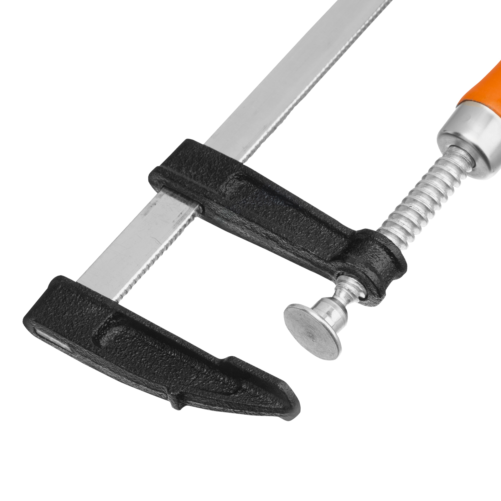 F-образная струбцина Sparta 204265 длиной 250 мм и величиной зажима 200 х 50 мм позволяет фиксировать заготовки из металла, древесины и других материалов для их соединения или обработки. Используется в столярном и слесарном деле. Деталь помещают между губками, одна из которых подвижна и служит для регулировки величины захвата. Винтовой зажим позволяет фиксировать заготовку со значительным усилием. Элементы конструкции выдерживают высокую температуру, поэтому струбцина подходит для проведения сварочных работ, при этом пластиковые накладки необходимо снять.