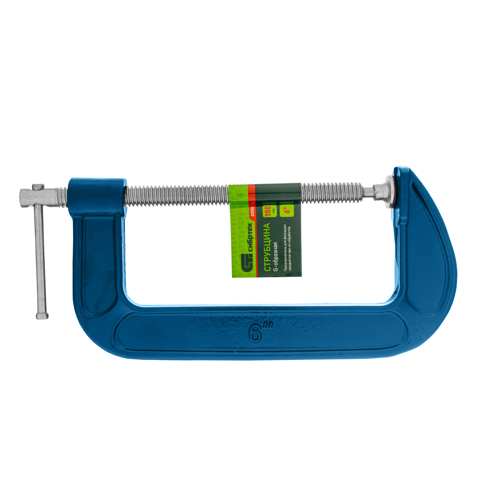 <p>Струбцина G-образная Сибртех 20586 с шириной зажима 150 мм применяется для фиксации заготовок с целью их склеивания, а также для крепления к верстаку или станку для опиливания, сверления и другой обработки. Может использоваться во время сварки металлических деталей. Рама выполнена из чугуна с шаровидным графитом, поэтому отличается высокой прочностью и устойчивостью к нагрузкам. Струбцина пригодится в слесарной и столярной мастерской, а также будет полезна в домашнем хозяйстве.</p><h2>Преимущества</h2><ul><li>Работа со значительным усилием — резьбовой шток изготовлен из прочной стали Ст3.</li><li>Надежная фиксация деталей — струбцина имеет подвижный зажим, установленный на шаровой шарнир.</li><li>Защита от коррозии — корпус струбцины покрыт порошковой эмалью, а шток оцинкован.</li></ul>