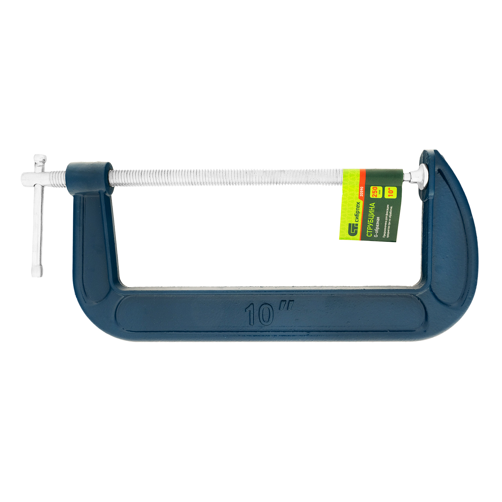 <p>Струбцина G-образная Сибртех 20590 с шириной зажима 250 мм применяется для фиксации заготовок с целью их склеивания, а также для крепления к верстаку или станку для опиливания, сверления и другой обработки. Может использоваться во время сварки металлических деталей. Рама выполнена из чугуна с шаровидным графитом, поэтому отличается высокой прочностью и устойчивостью к нагрузкам. Струбцина пригодится в слесарной и столярной мастерской, а также будет полезна в домашнем хозяйстве.</p><h2>Преимущества</h2><ul><li>Работа со значительным усилием — резьбовой шток изготовлен из прочной стали Ст3.</li><li>Надежная фиксация деталей — струбцина имеет подвижный зажим, установленный на шаровой шарнир.</li><li>Защита от коррозии — корпус струбцины покрыт порошковой эмалью, а шток оцинкован.</li></ul>