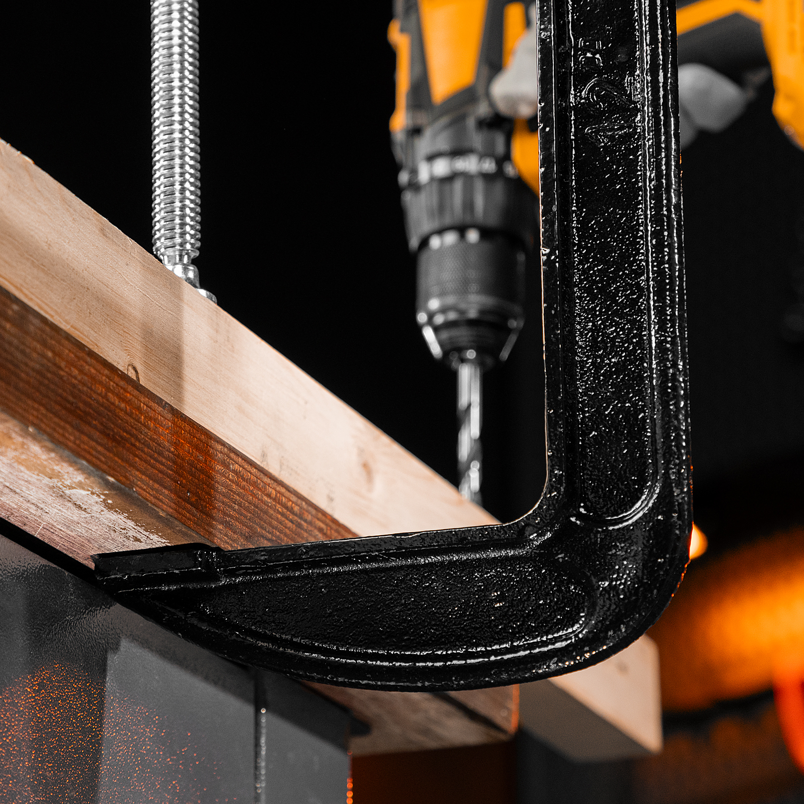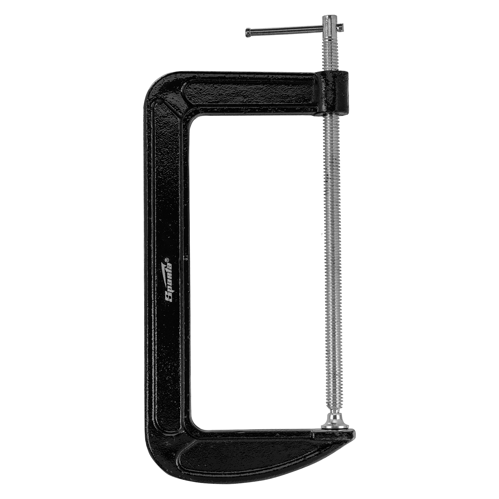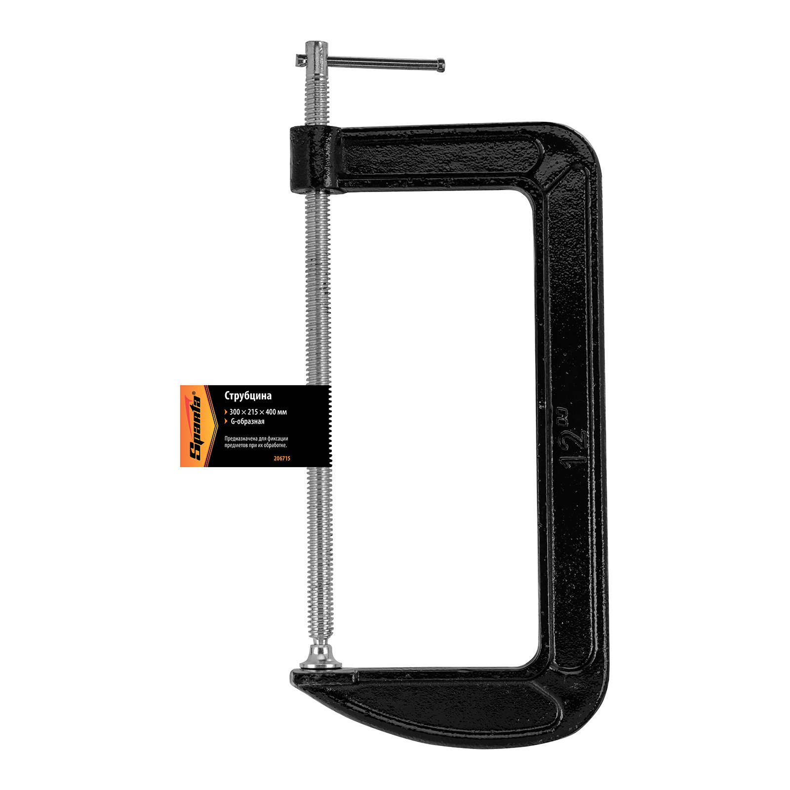<p>G-образная струбцина Sparta 206715 с шириной зажима 300 мм надежно фиксирует различные детали для дальнейшего склеивания, сверления, пиления, шлифования или сварки. Винт с воротком и крупной червячной резьбой позволяет зажимать детали плавно и со значительным усилием. Струбцина будет полезна домашнему мастеру.</p><h2>Преимущества</h2><ul><li>Прочность — чугунная рама устойчива к нагрузкам.</li><li>Защита от коррозии и механических повреждений — на раму нанесено цветное лаковое покрытие.</li><li>Удобное использование — подвижный зажим обеспечивает надежную фиксацию заготовки.</li></ul>