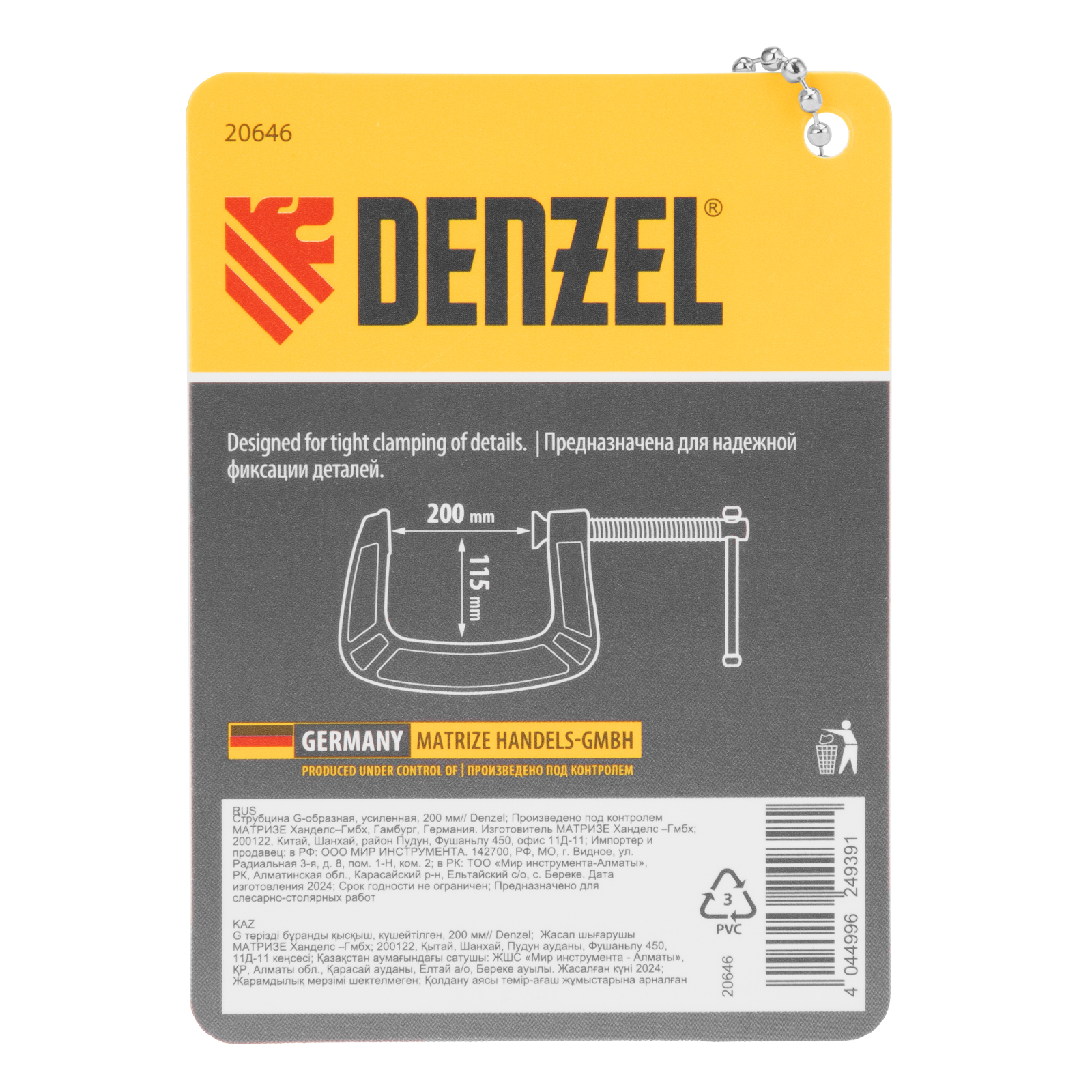 <p>G-образная струбцина Denzel 20646 с максимальной шириной зажима 200 мм используется для фиксации заготовок или закрепления их на верстаке, станке или между собой. Позволяет склеивать детали, а также сверлить их, шлифовать, опиливать и проводить другие работы. Может использоваться во время выполнения сварочных работ. Винт с трапециевидной резьбой обеспечивает надежную фиксацию предметов. Струбцина применяется в слесарном и столярном деле, будет полезна также домашнем хозяйстве.</p><h2>Преимущества</h2><ul><li>Устойчивость к нагрузкам — массивная рама изготовлена из высокопрочного чугуна с шаровидным графитом и усилена ребрами жесткости.</li><li>Долговечность — подвижные части фосфатированы для предотвращения образования коррозии.</li><li>Надежность — резьбовой шток с трапециевидной резьбой позволяет создавать высокое усилие зажима, обеспечивает плавность хода и износостойкость.</li></ul>
