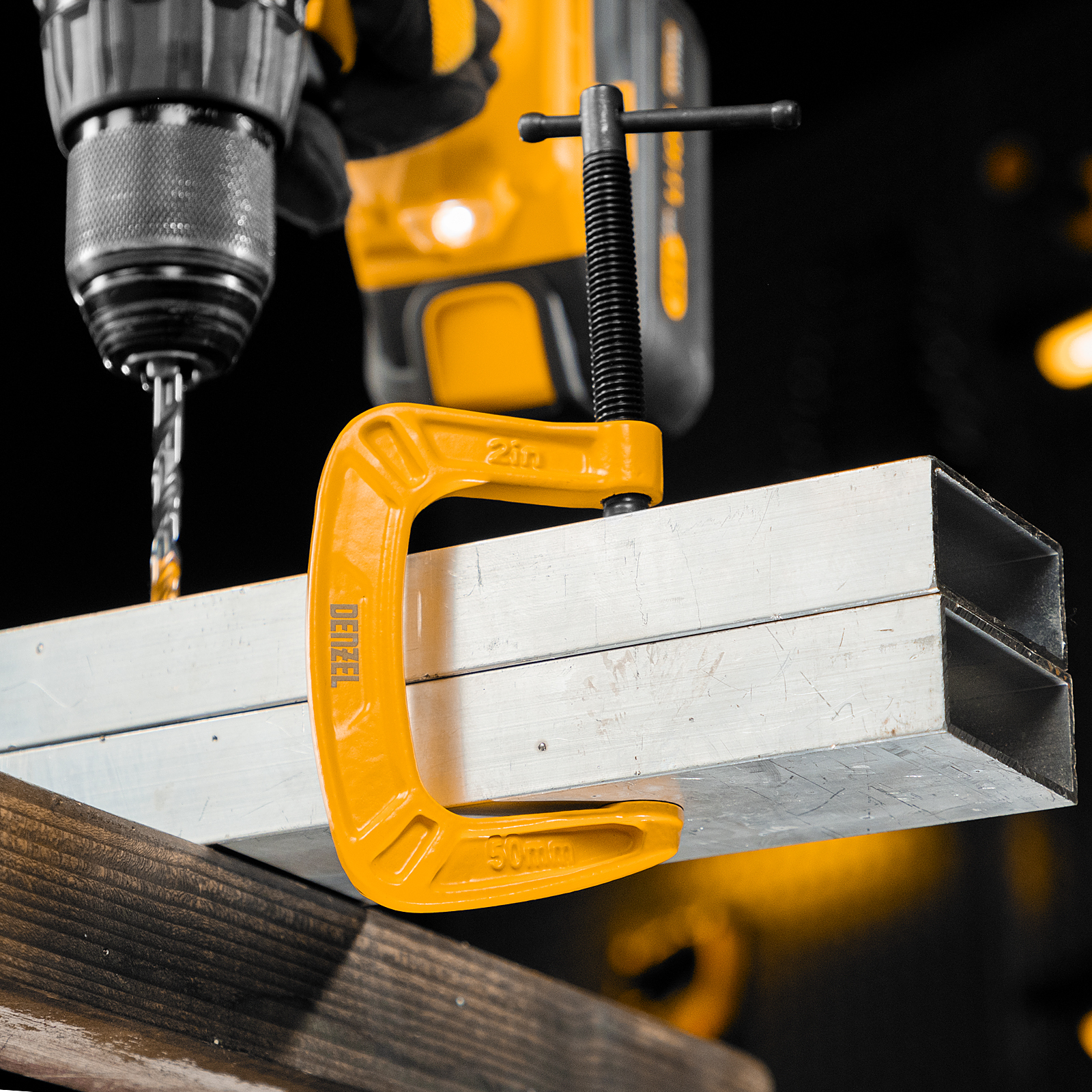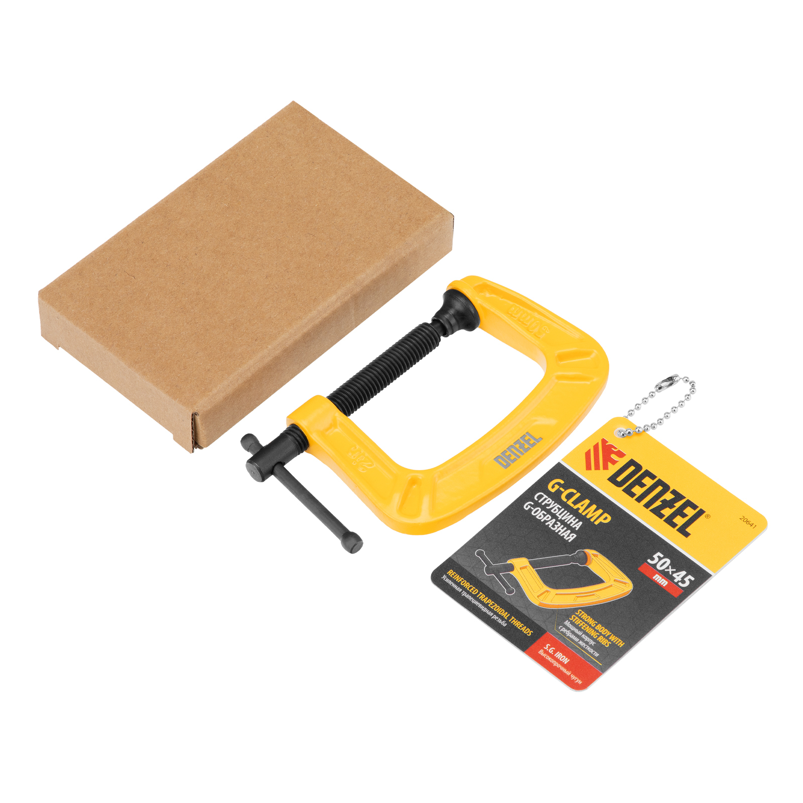 <p>G-образная струбцина Denzel 20641 с максимальной шириной зажима 50 мм используется для фиксации заготовок или закрепления их на верстаке, станке или между собой. Позволяет склеивать детали, а также сверлить их, шлифовать, опиливать и проводить другие работы. Может использоваться во время выполнения сварочных работ. Винт с трапециевидной резьбой обеспечивает надежную фиксацию предметов. Струбцина применяется в слесарном и столярном деле, будет полезна также домашнем хозяйстве.</p><h2>Преимущества</h2><ul><li>Устойчивость к нагрузкам — массивная рама изготовлена из высокопрочного чугуна с шаровидным графитом и усилена ребрами жесткости.</li><li>Долговечность — подвижные части фосфатированы для предотвращения образования коррозии.</li><li>Надежность — резьбовой шток с трапециевидной резьбой позволяет создавать высокое усилие зажима, обеспечивает плавность хода и износостойкость.</li></ul>