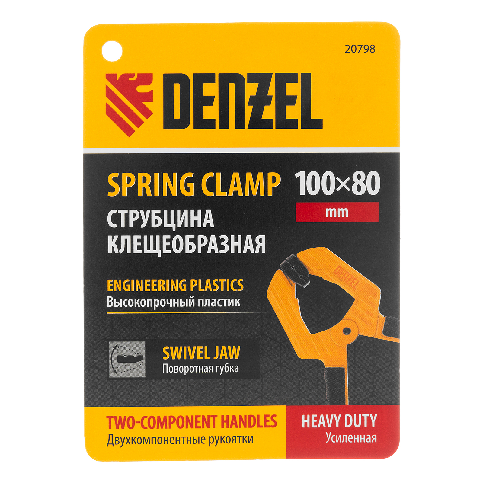<p>Струбцина клещеобразная удлиненная Denzel 20798 с глубиной зажима 80 мм, с двухкомпонентными рукоятками, способна удерживать детали толщиной до 100 мм. Будет полезна при склеивании или разметке заготовок. Подвижные губки с углублениями на прижимных поверхностях позволяют максимально точно позиционировать деталь при захвате. Струбцина пригодится в столярной мастерской, дома или на даче.</p><h2>Преимущества</h2><ul><li>Надежность и долговечность — корпус из ударопрочного пластика усилен ребрами жесткости, поэтому выдерживает значительные нагрузки при сжатии.</li><li>Надежная фиксация — усиленная пружина позволяет крепко удерживать обрабатываемую деталь.</li><li>Комфортная работа — двухкомпонентные рукоятки с рельефной поверхностью обеспечивают надежный захват.</li></ul>
