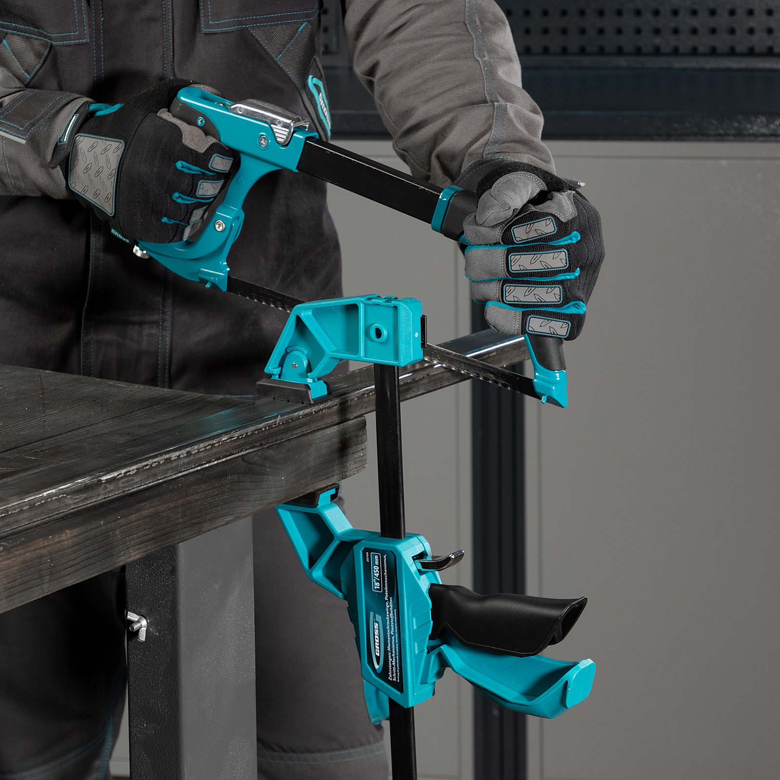 - Многофункциональность — опорную губку можно переставить на другой конец рейки, чтобы использовать струбцину как распорный инструмент.