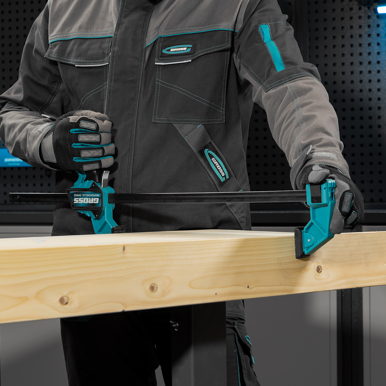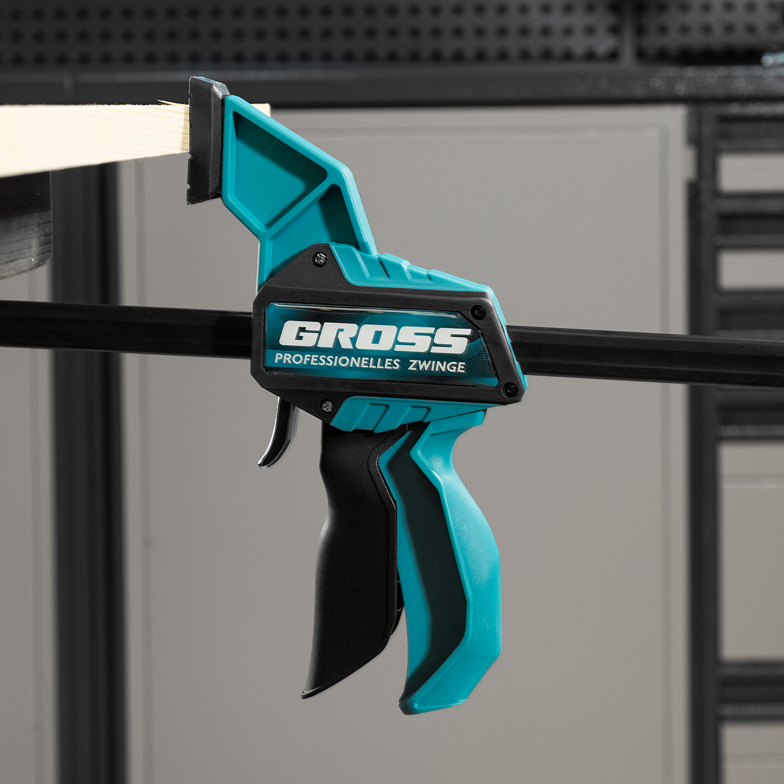 Реечная быстрозажимная струбцина Gross 20704 пистолетного типа, с пластиковым корпусом, с шириной зажима 450 мм, с пошаговым механизмом, используется для зажимания заготовок при выполнении столярных или монтажных работ. Удобна для фиксации деревянных деталей, т. к. пластиковые накладки на губках не повреждают их поверхность при сжатии. Подвижная губка пошагово перемещается по рейке, постепенно зажимая обрабатываемый предмет. Курковый фиксатор удерживает ее в заданном положении. Инструмент рекомендован для профессионального использования.