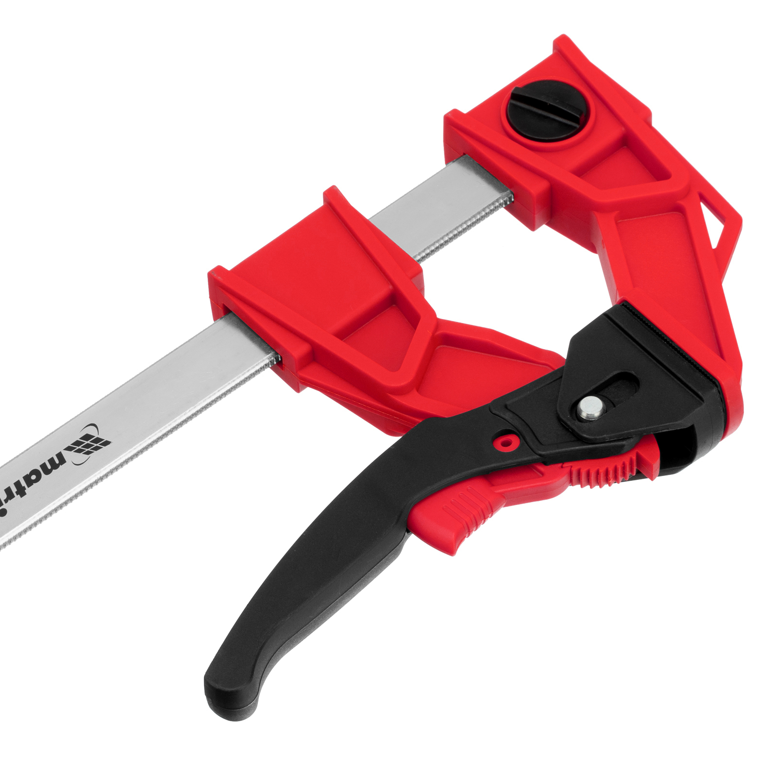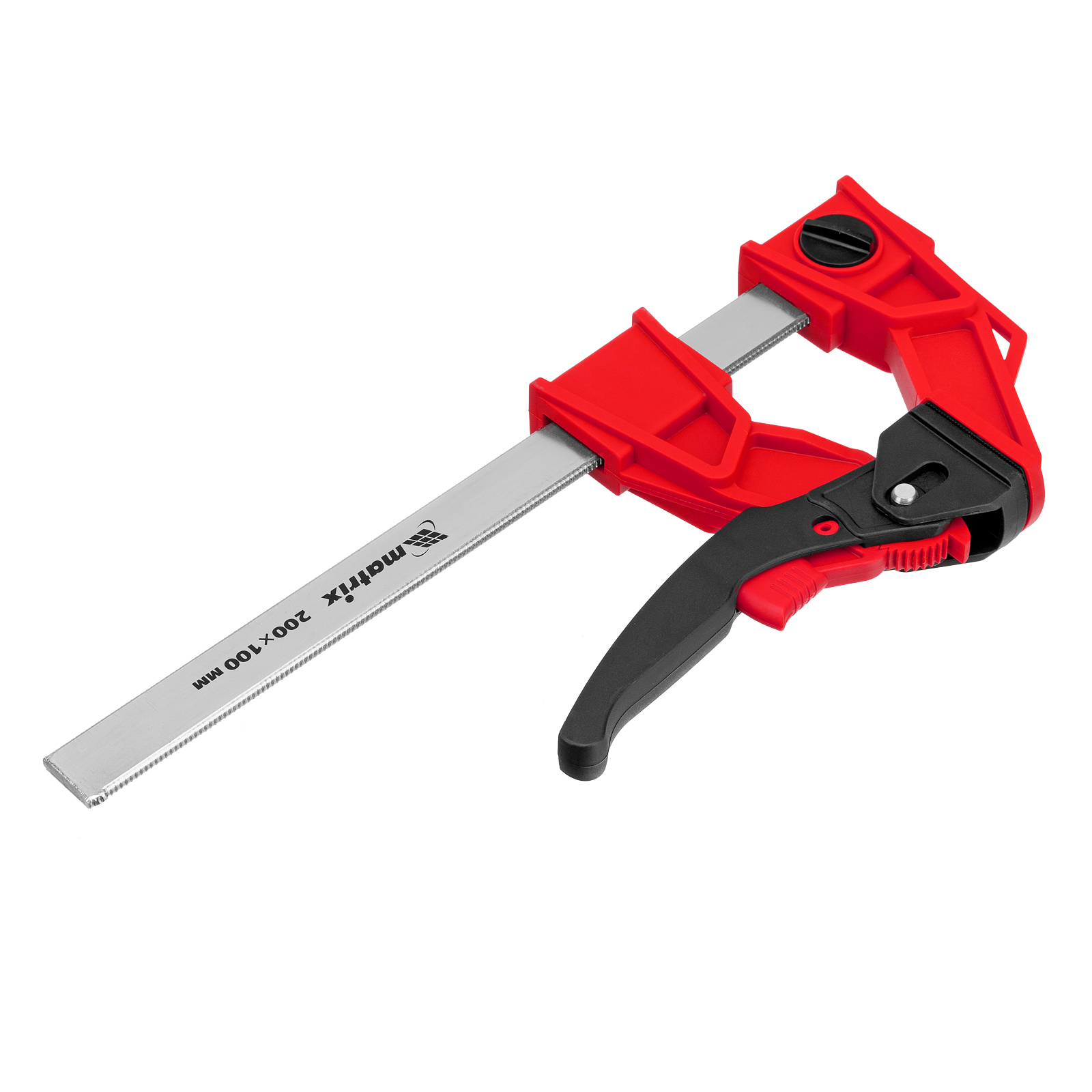 <p>Струбцина реечная быстрозажимная Matrix 20726 размером 200 х 100 х 351 мм, со штангой сечением 5 х 22 мм, с усиленным пластиковым корпусом и рычажным храповым механизмом, предназначена для кратковременной фиксации деталей с целью их склеивания, а также опиливания, сверления и другой обработки. Рычажный храповой механизм позволяет перемещать подвижную губку на небольшое расстояние, сжимая заготовку со значительным усилием. Струбцина пригодится в столярной мастерской, а также будет полезна в быту.</p><h2>Преимущества</h2><ul><li>Надежность — стальная рейка и усиленный корпус из ударопрочного пластика выдерживают значительные нагрузки при сжатии.</li><li>Аккуратная работа с древесиной — пластиковые губки не повреждают поверхность заготовок.</li><li>Дополнительные возможности — съемную неподвижную губку можно перевернуть на рейке, превратив струбцину в распорный инструмент.</li></ul>
