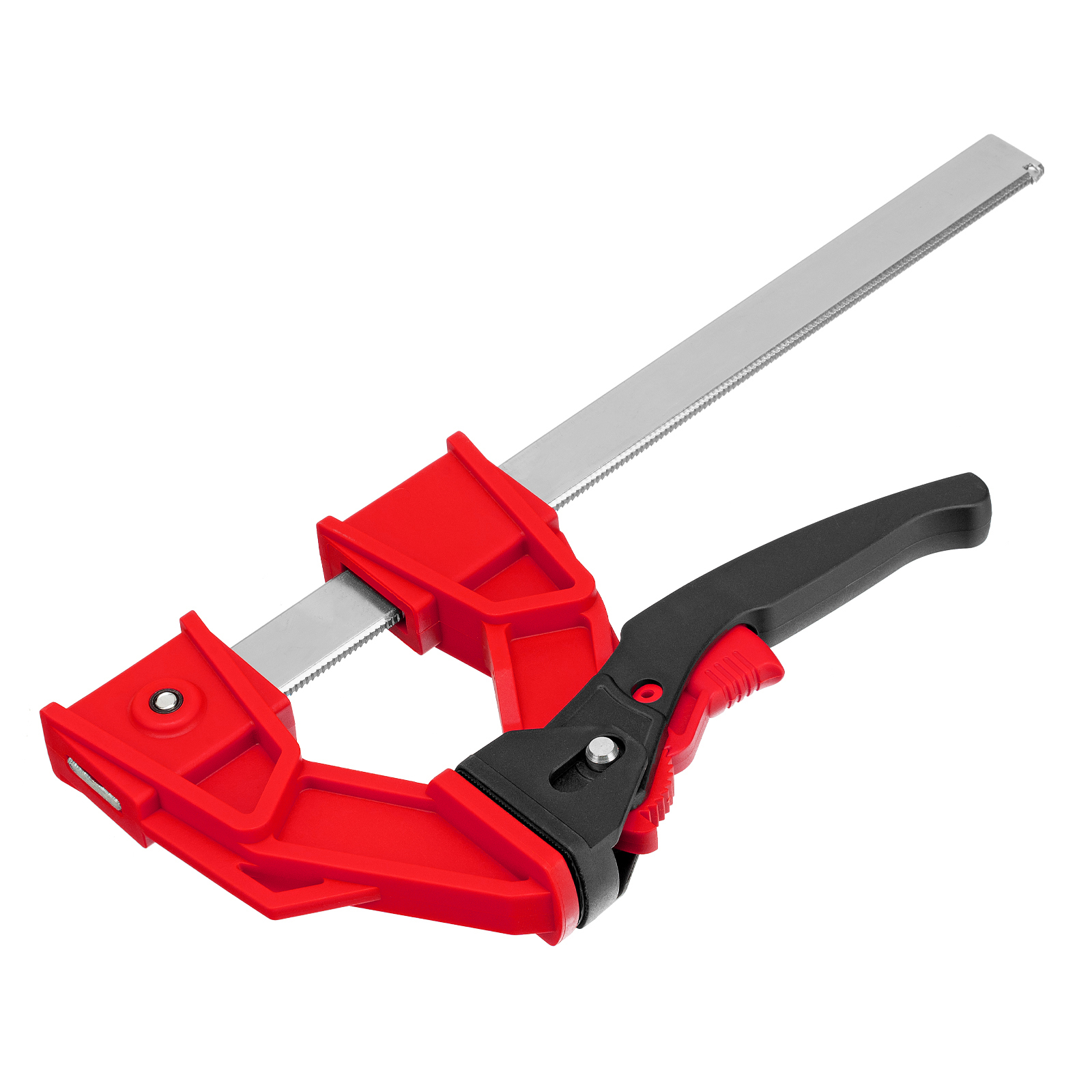 - Дополнительные возможности — съемную неподвижную губку можно перевернуть на рейке, превратив струбцину в распорный инструмент.