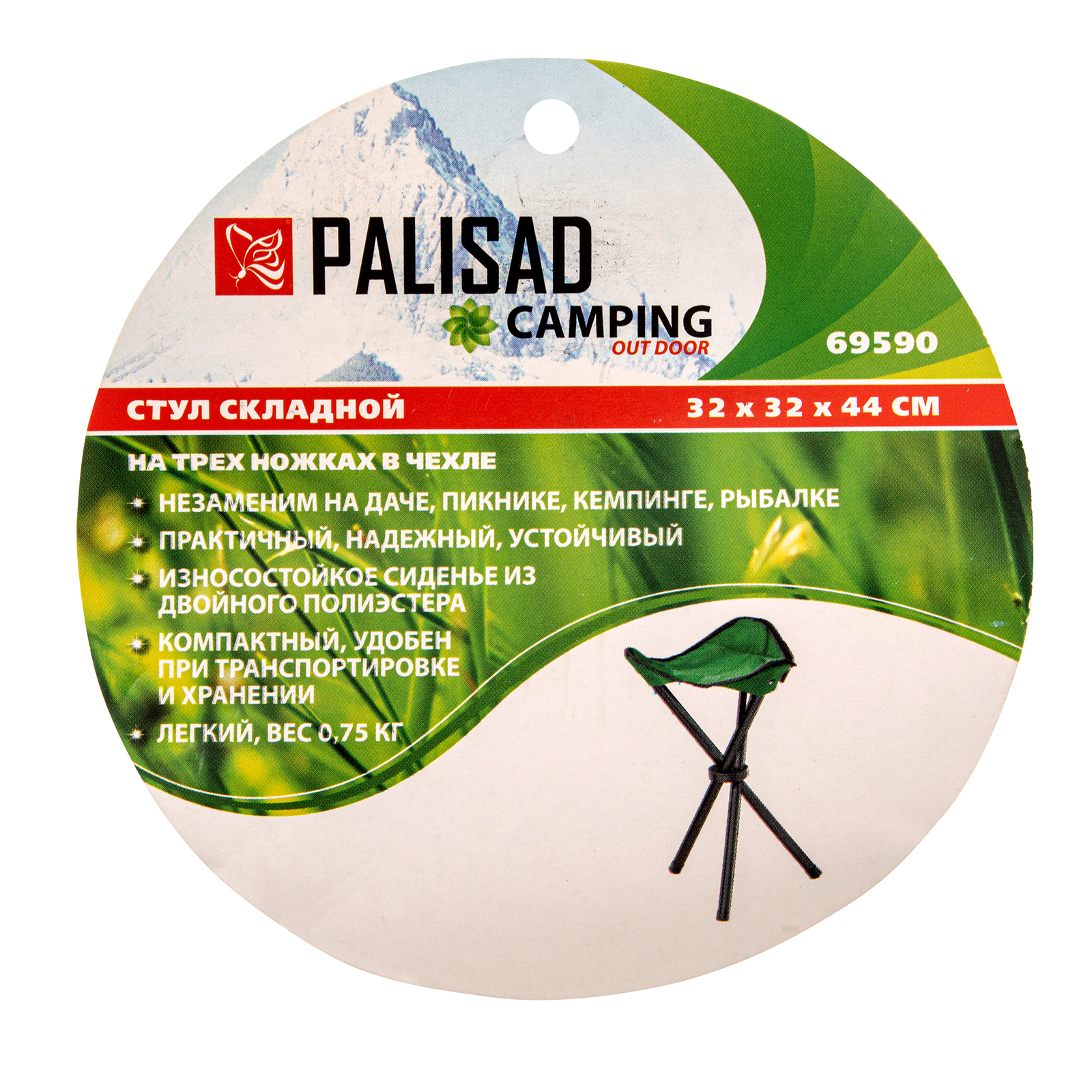 <p>Складной стул Palisad Camping 69590 на 3 ножках, размером 32 х 32 х 44 см, позволит с удобством расположиться на дачном участке, на пикнике или рыбалке, устроить привал во время длительной прогулки. Благодаря оригинальной конструкции стул в сложенном состоянии очень компактен, поэтому его удобно брать с собой.</p><h2>Преимущества</h2><ul><li>Прочность и долговечность — сиденье изготовлено из износостойкого полиэстера плотностью 600D.</li><li>Водонепроницаемость — материал сиденья обработан специальной пропиткой.</li><li>Надежность — ножки диаметром 16 мм выполнены из стали, поэтому стул выдерживает вес до 90 кг.</li><li>Удобное хранение и транспортировка — стул весит всего 0,725 кг и комплектуется чехлом.</li></ul>
