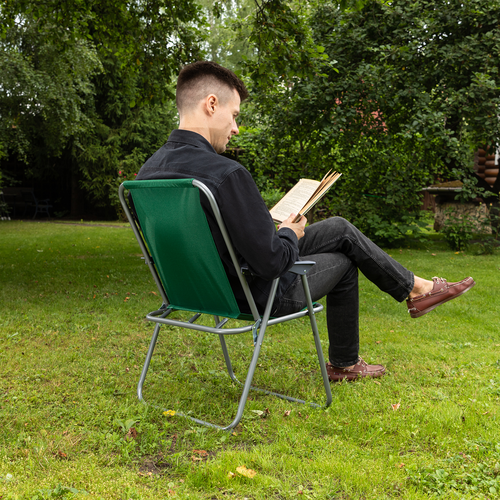 Складной стул Palisad Camping 69591 с подлокотниками, размером 60 х 53 х 75 см, сделает комфортным отдых на природе, а также выручит дома или на даче в случае прихода гостей. Благодаря спинке и подлокотникам благополучно заменяет кресло.