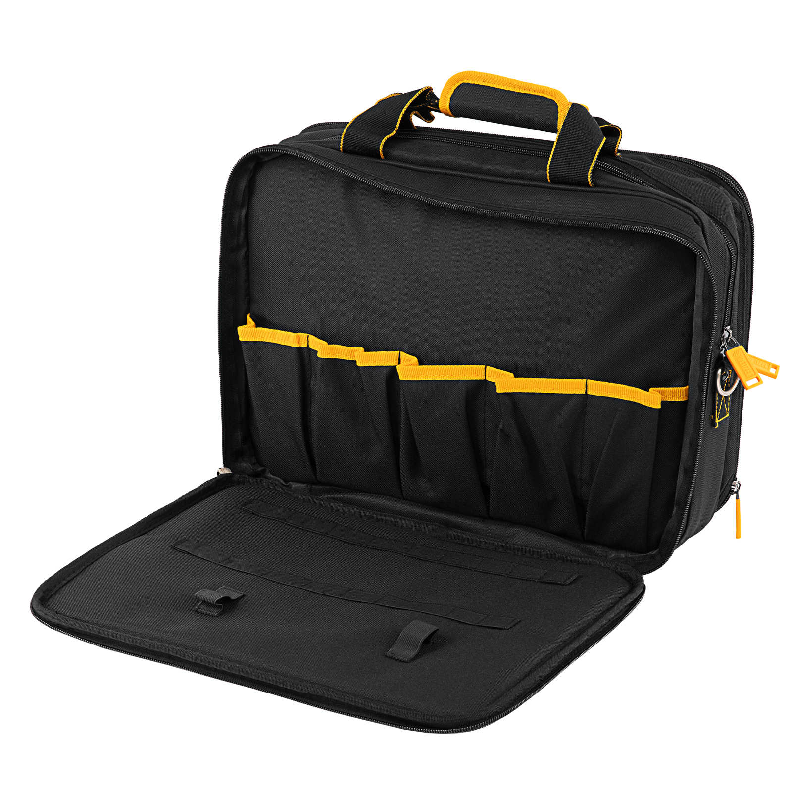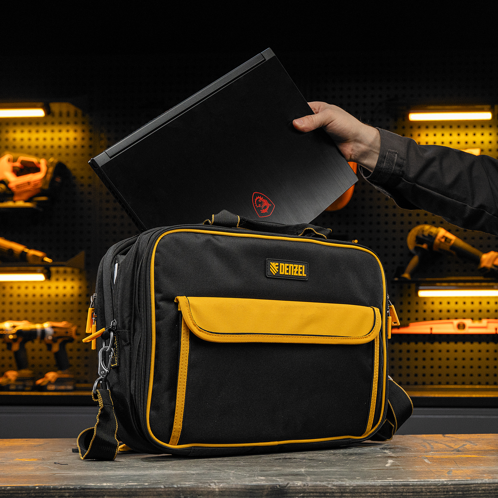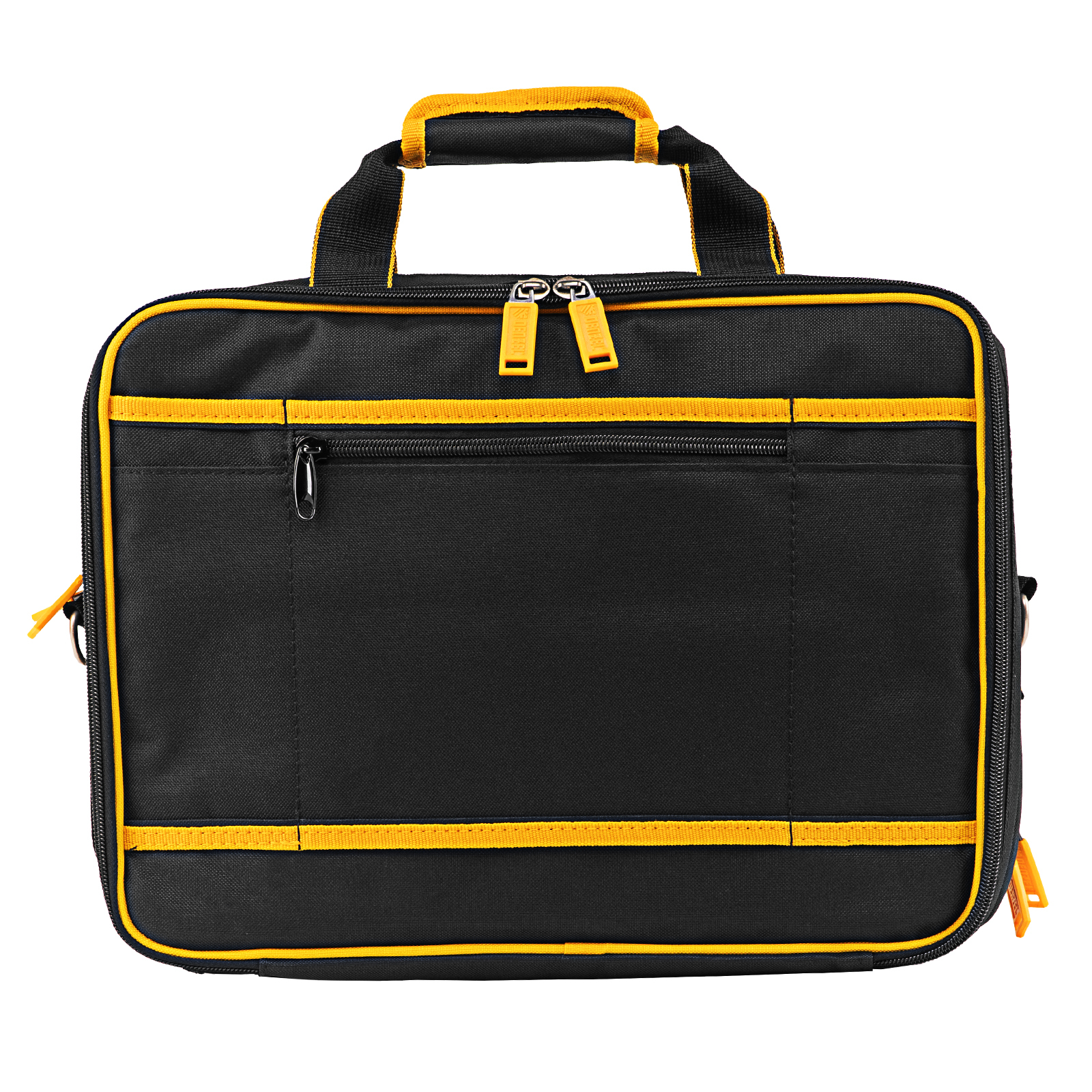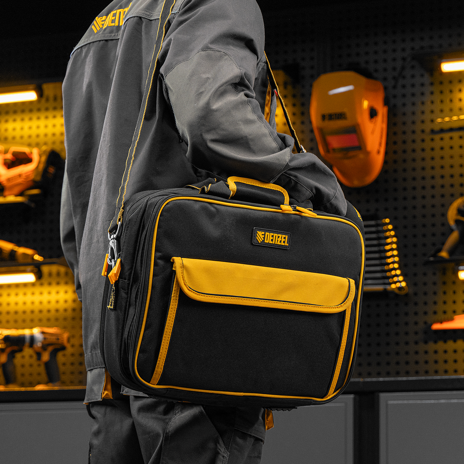 Сумка Denzel 90295 габаритами 400 х 170 х 300 мм, с наплечным ремнем, имеет 3 отделения и 28 карманов, в которых можно разместить необходимые инструменты, оснастку и расходники. Пригодится дома, в гараже и в поездке.