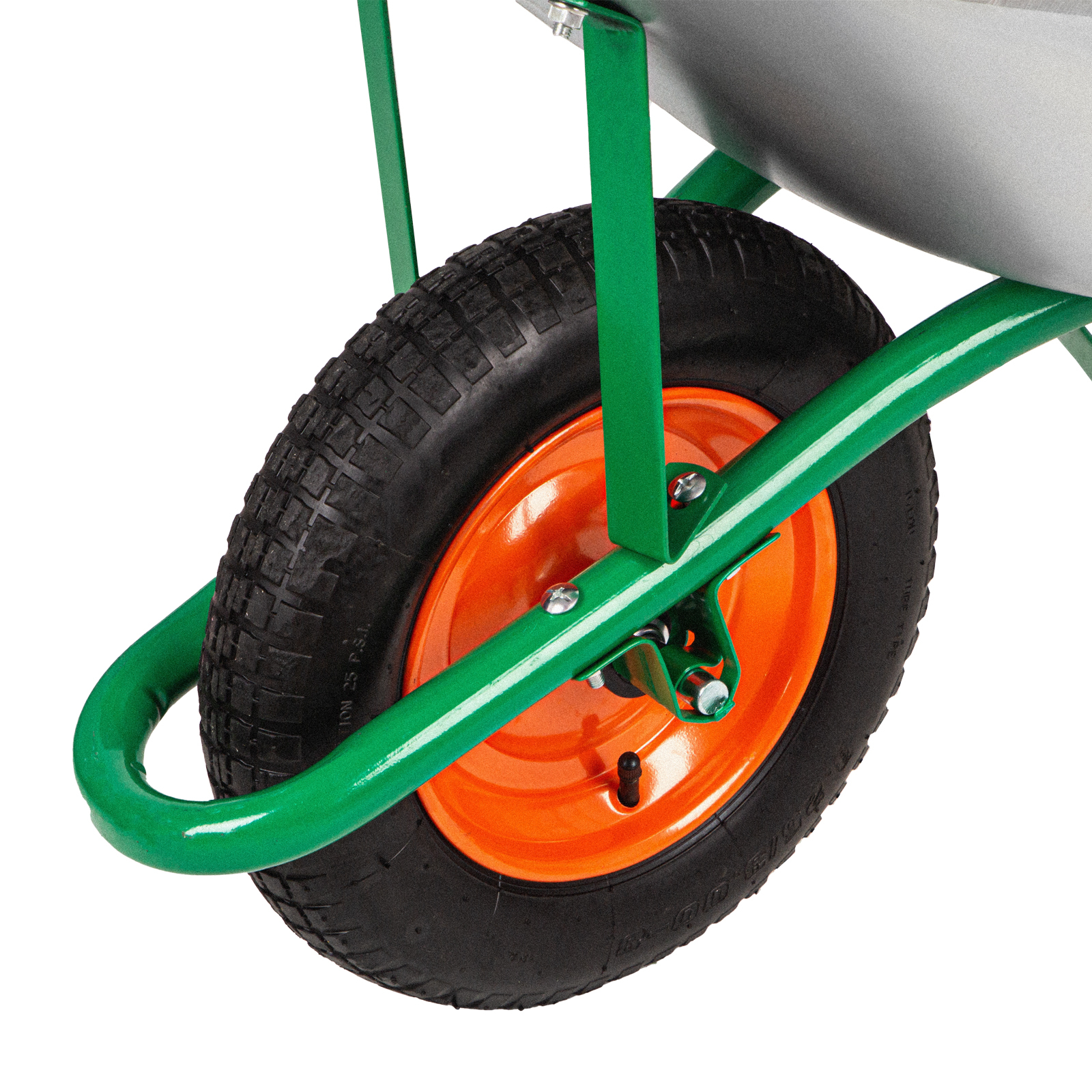 - Маневренность — колесо с двумя шариковыми подшипниками легко вращается и позволяет разворачивать тачку в узких местах.