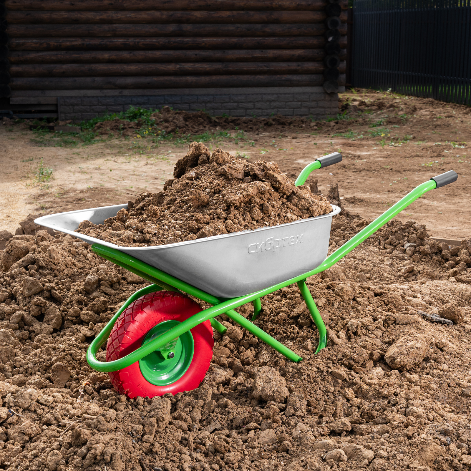 Садово-строительная тачка Сибртех 68968 с PU колесом, грузоподъемностью 180 кг и объемом кузова 90 л, используется для перемещения грунта, песка, мусора, веток или строительных смесей. Будет полезна на строительной площадке и дачном участке. Благодаря одному колесу тачка очень маневренна, ее удобно разворачивать и провозить в узких местах.