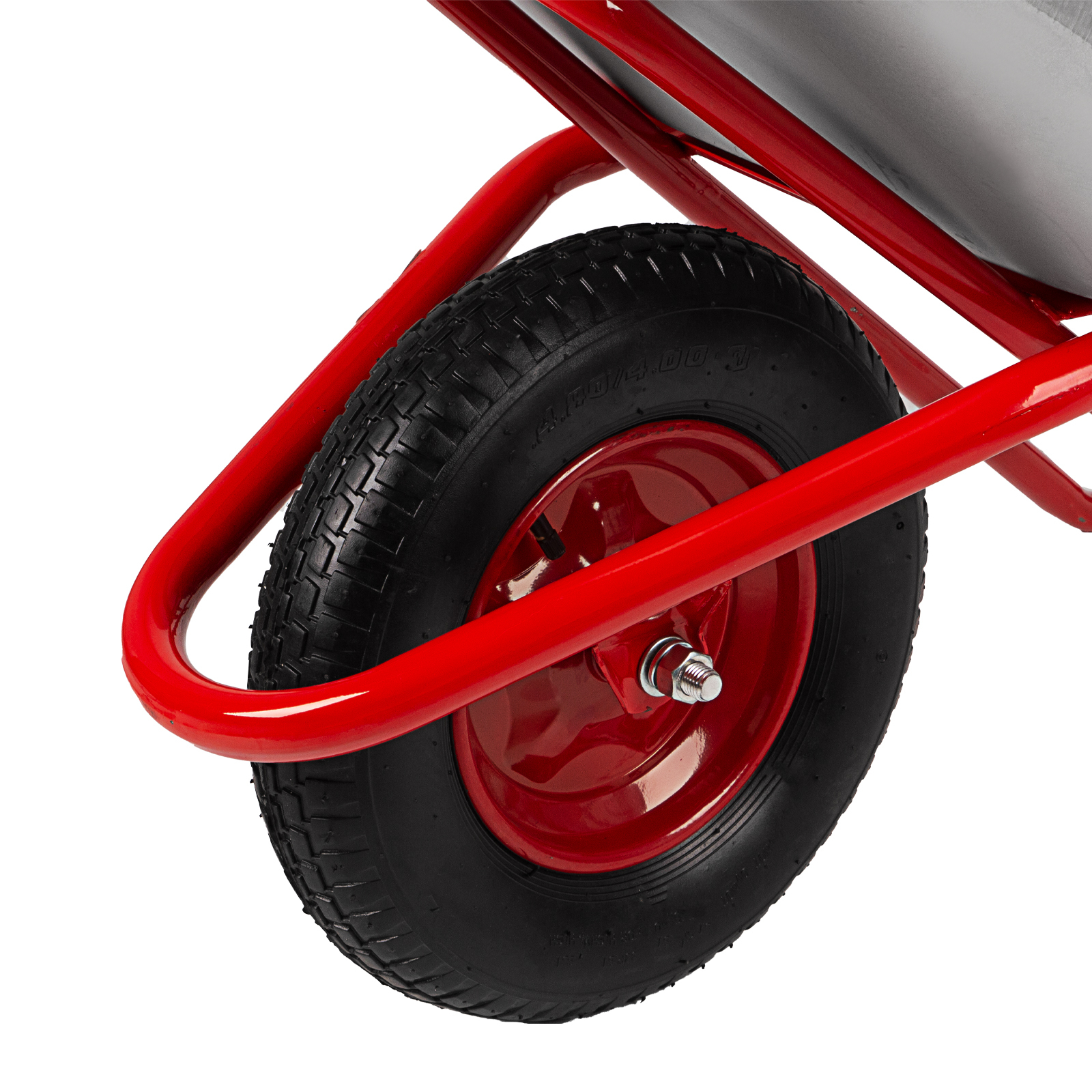 - Мягкий и плавный ход — пневмоколесо поглощает вибрации и упрощает перемещение тачки по неровной поверхности, а 2 шариковых подшипника облегчают его вращение.