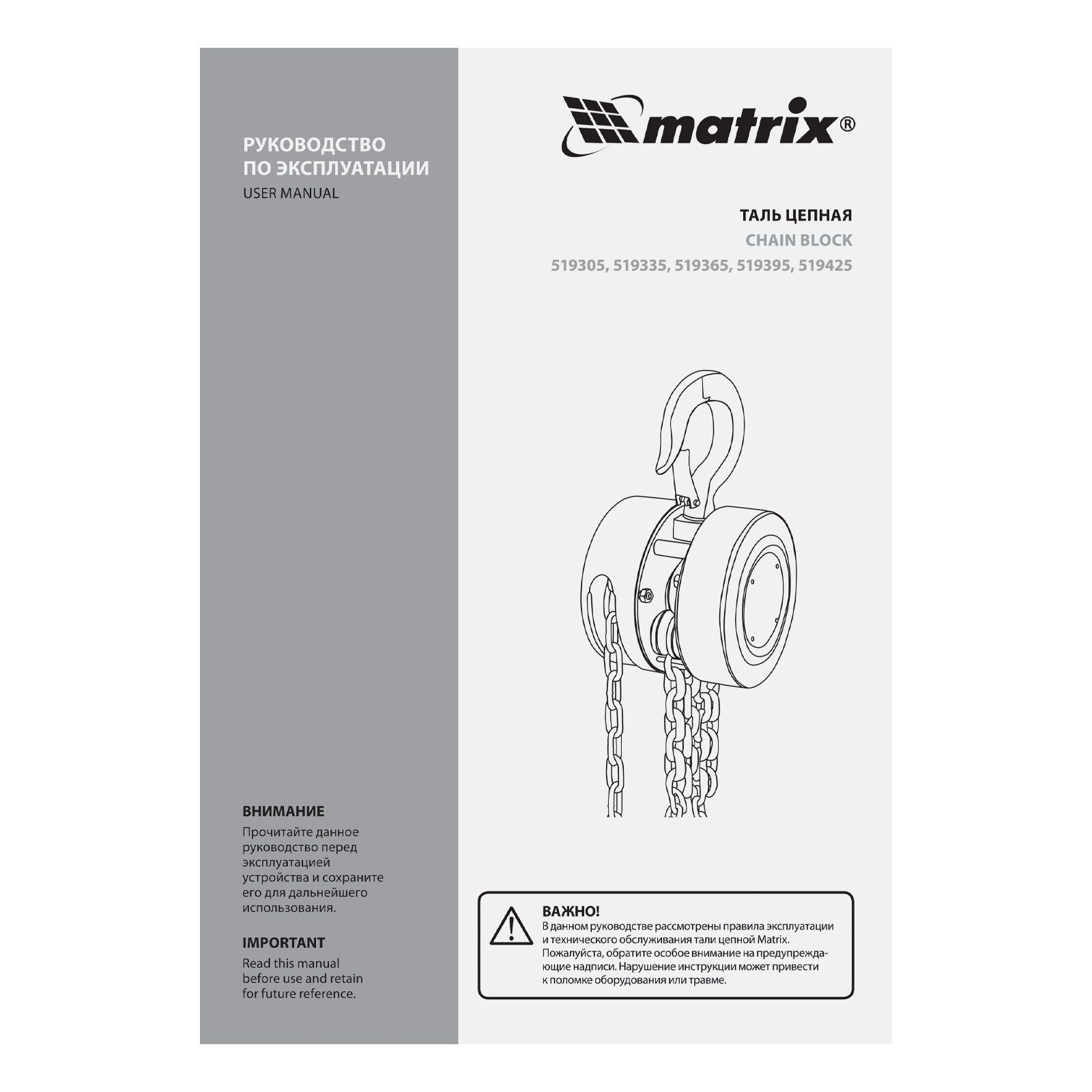 <p>Цепная таль Matrix 519365 с расстоянием между крюками 380 мм позволяет поднимать грузы весом не более 2 т на высоту до 2,5 м. Простая конструкция облегчает использование. Механизм пригодится для проведения погрузочно-разгрузочных, ремонтных, монтажных работ.</p><h2>Преимущества</h2><ul><li>Надежность — таль изготовлена из прочных материалов, устойчивых к высоким нагрузкам.</li><li>Защита от самопроизвольного опускания груза — производитель предусмотрел встроенный тормоз.</li><li>Безопасная работа — крюки оснащены коваными предохранительными защелками.</li><li>Автономность — таль с ручным приводом работает без подключения к электросети.</li></ul>