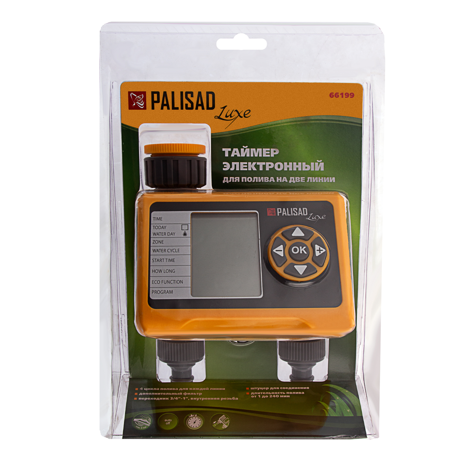 <p>Электронный таймер Palisad LUXE 66199, можно одновременно подключить к двум водозаборным линиям для повышения эффективности полива. В его системе предусмотрено 12 программ для возможности выбора оптимальной в зависимости от растений. Таймер позволяет полностью автоматизировать систему полива, включая и отключая воду в течение нескольких дней, поэтому пригодится дачникам, которые не могут часто бывать на участке.</p><h2>Преимущества</h2><ul><li>Прочность конструкции таймера достигается за счет ABS-пластика, из которого он изготовлен.</li><li>Таймер предусматривает возможность отдельной настройки линий для возможности полива различных растений или отключения ненужной при необходимости.</li><li>Таймер оснащен фильтрующим элементом, который не допускает его засорения.</li><li>Быстросъемный коннектор позволяет легко подключать и отключать таймер.</li></ul>