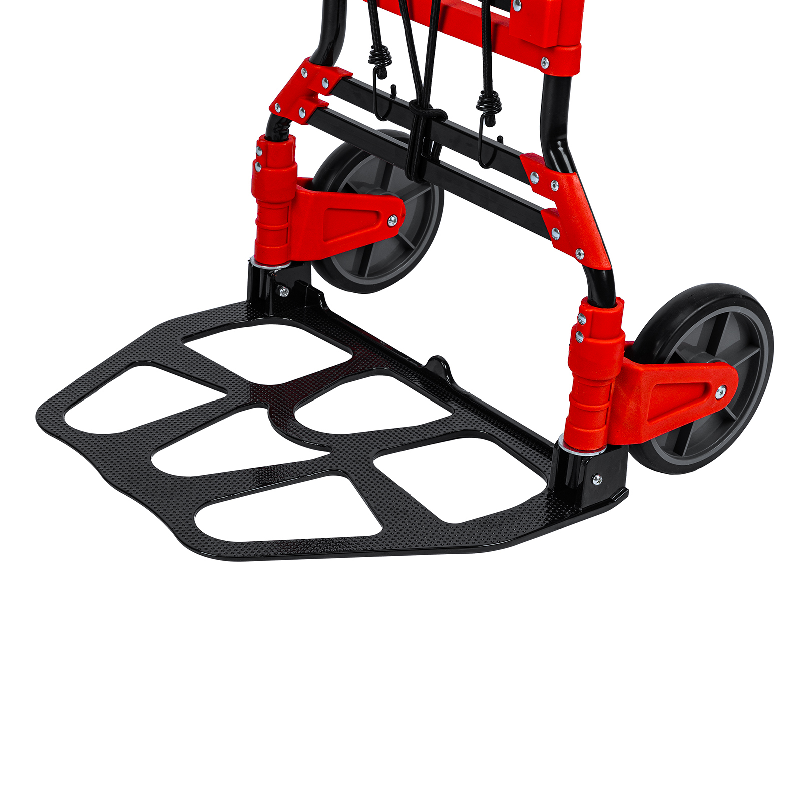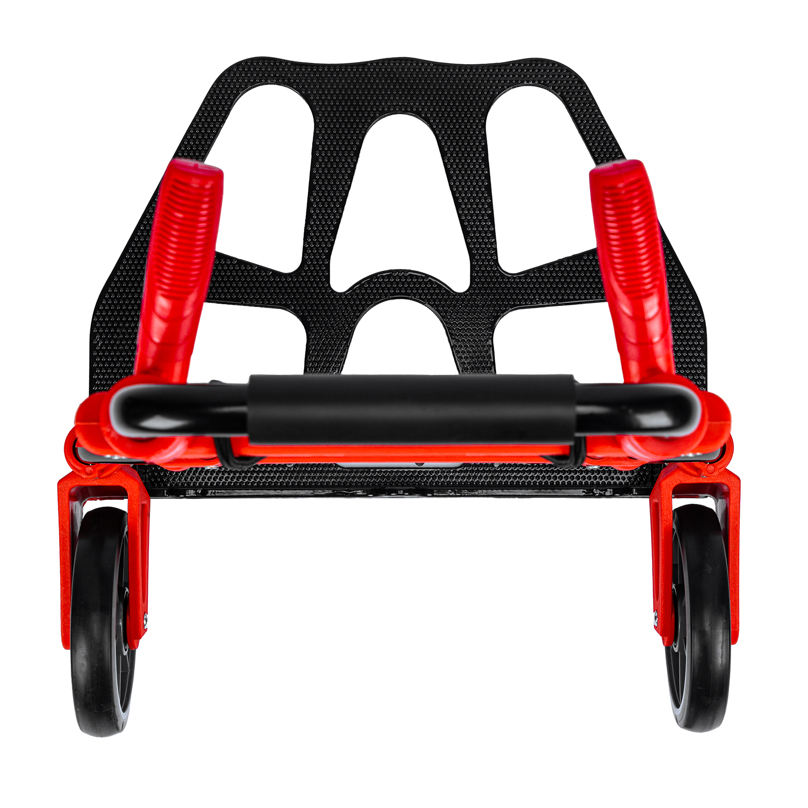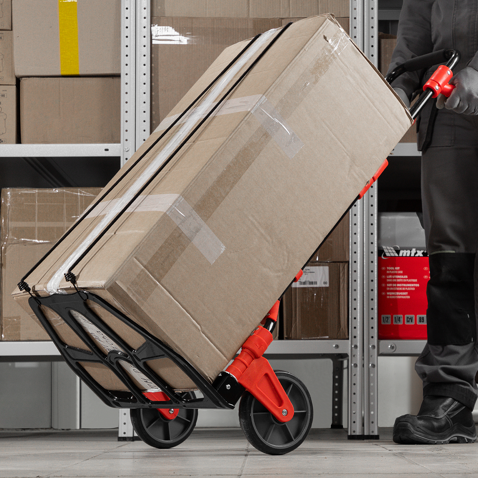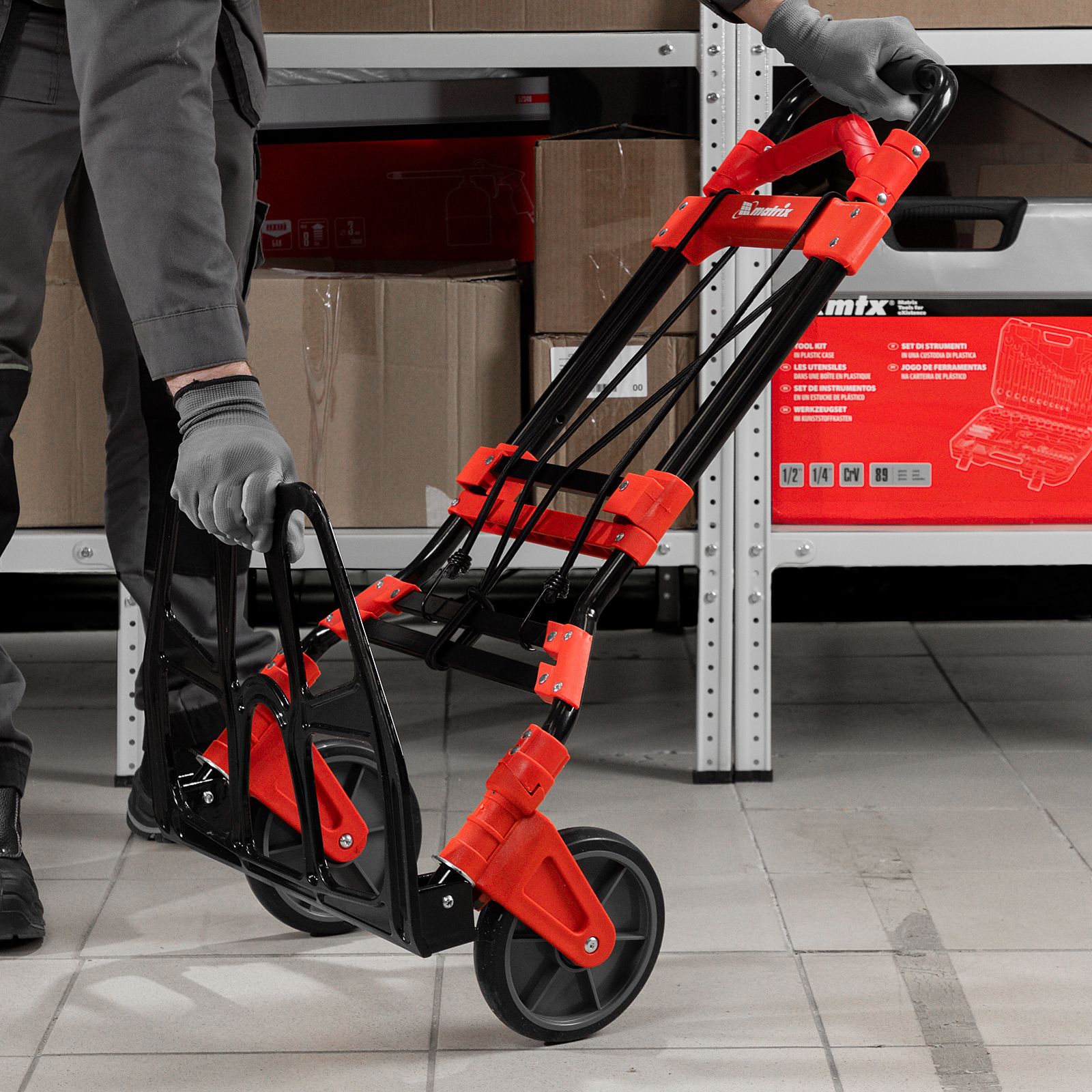 - Удобное хранение и транспортировка — платформа и колеса складываются, поэтому тележка не занимает много места.
