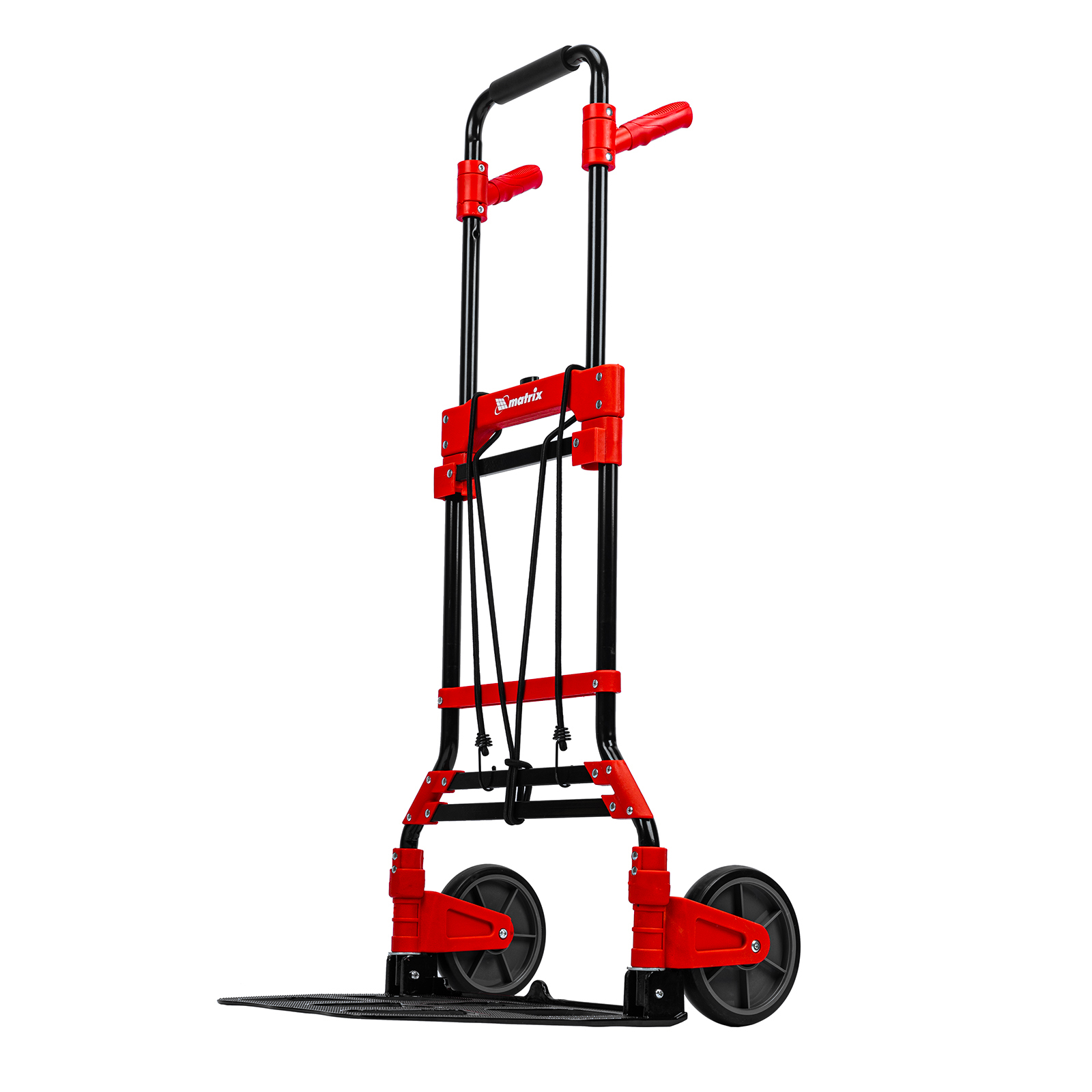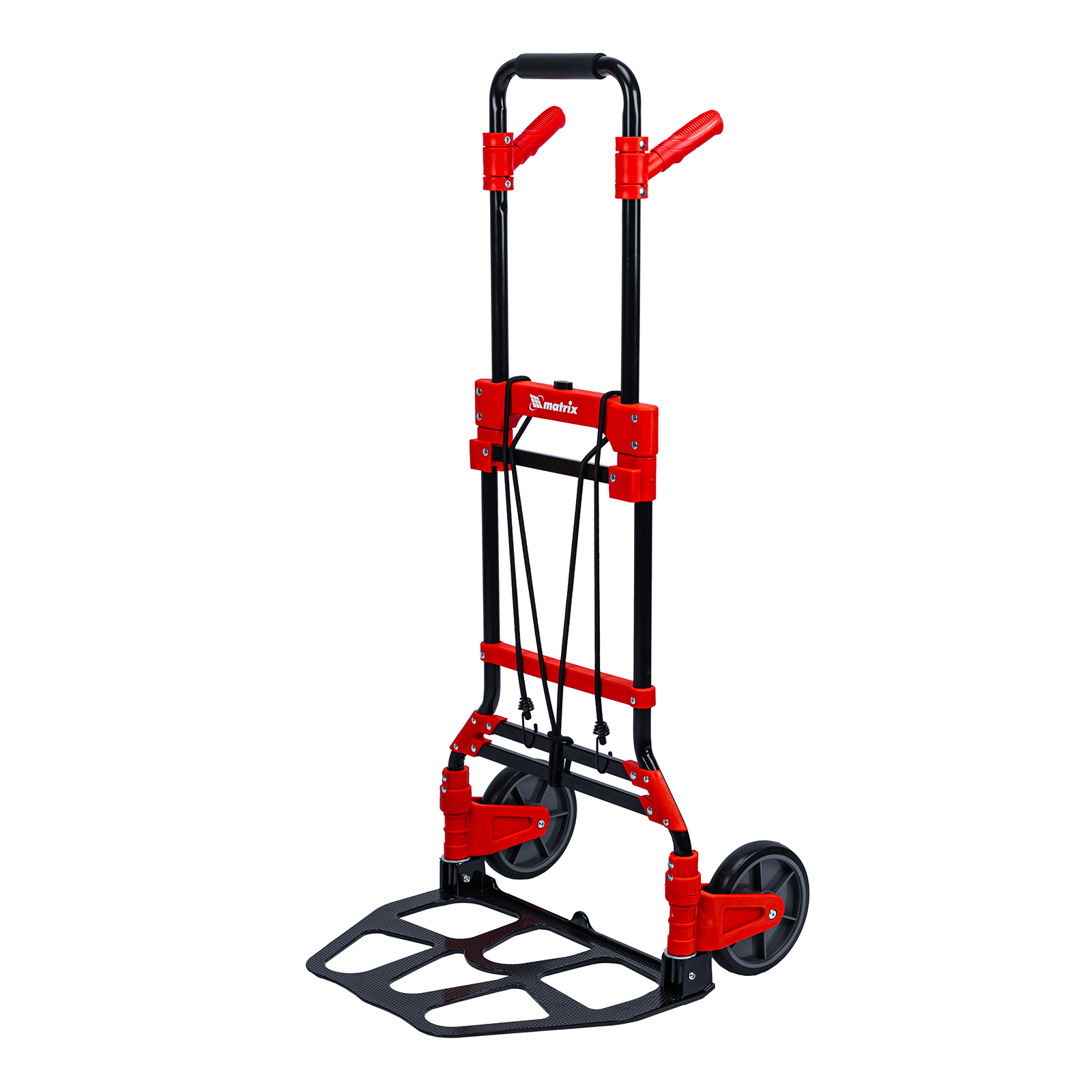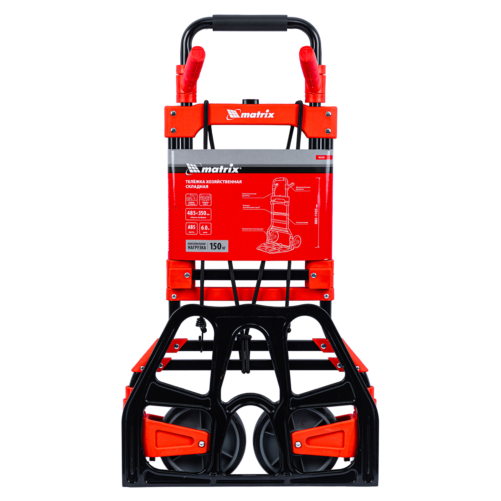 <p>Складная хозяйственная 2-колесная тележка Matrix 98208 предназначена для перемещения грузов массой до 150 кг. Телескопическая рукоятка позволяет регулировать высоту тележки в соответствии с ростом пользователя. Для размещения груза предусмотрена платформа размером 485 x 350 мм.</p><h2>Преимущества</h2><ul><li>Надежное размещение груза — крепкие багажные резинки прочно фиксируют его на платформе.</li><li>Прочная конструкция — стальная рама выдерживает высокие нагрузки без риска деформации.</li><li>Максимально удобная эксплуатация — дополнительные рукоятки облегчают транспортировку груза.</li><li>Удобное хранение и транспортировка — платформа и колеса складываются, поэтому тележка не занимает много места.</li></ul>