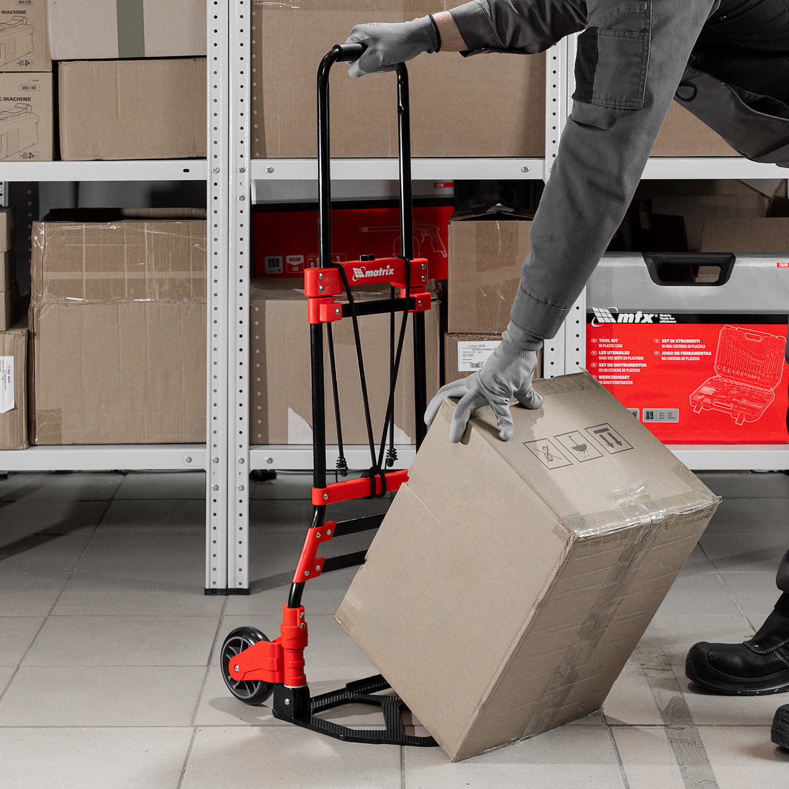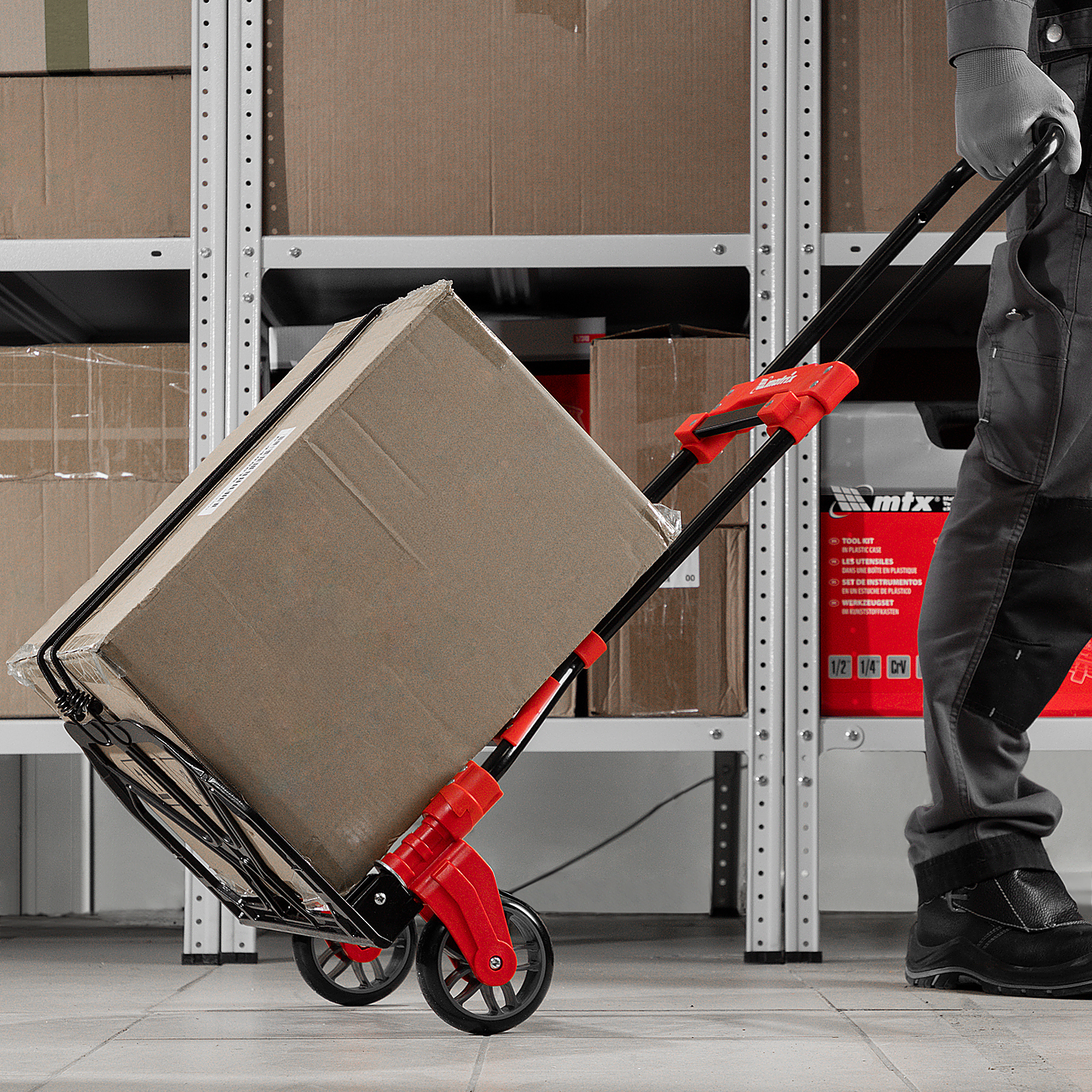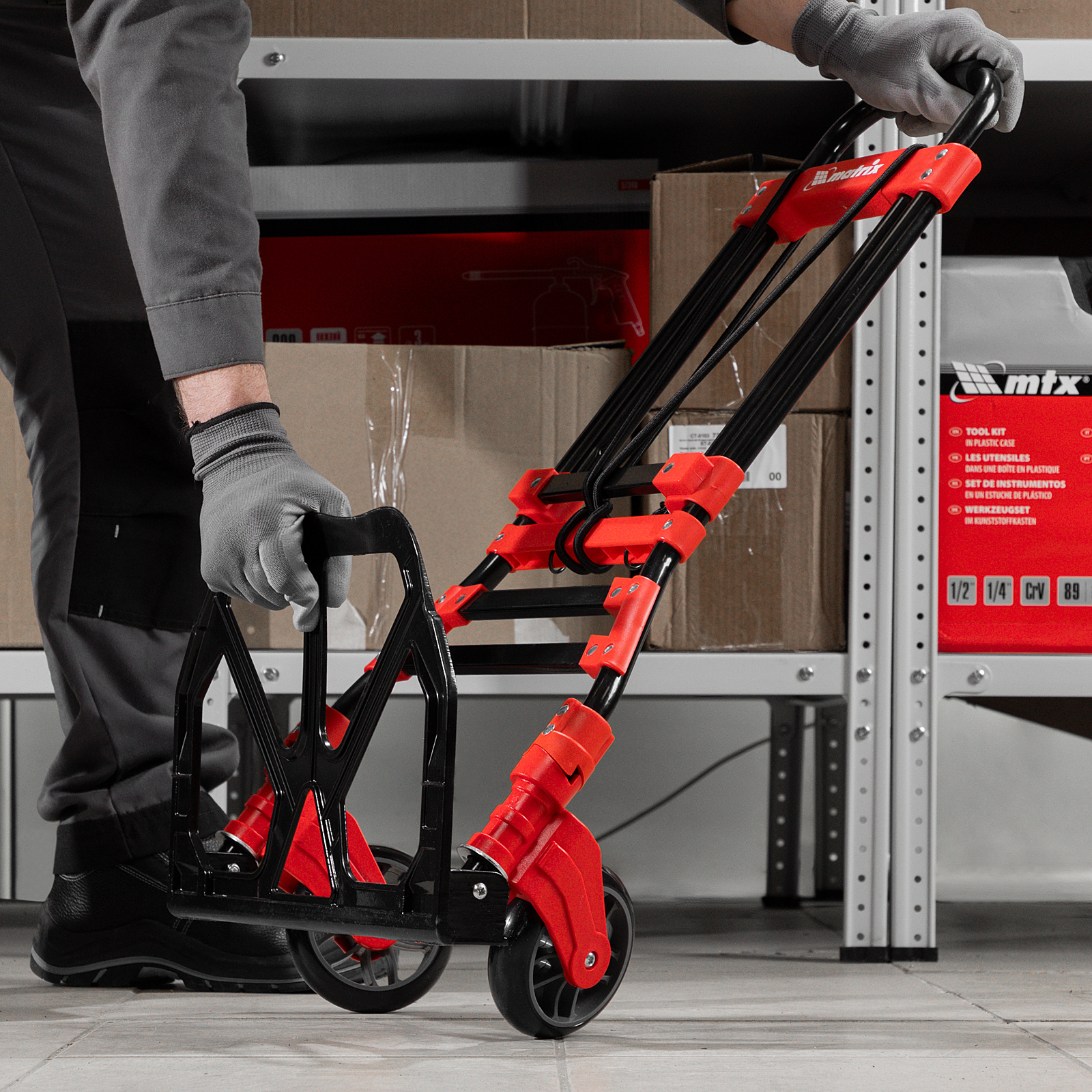 - Удобное хранение и транспортировка — платформа и колеса складываются, поэтому тележка не занимает много места.